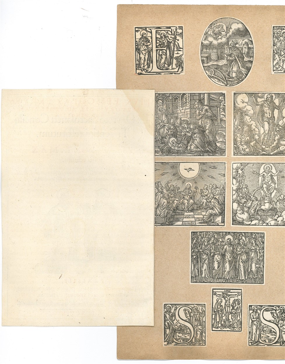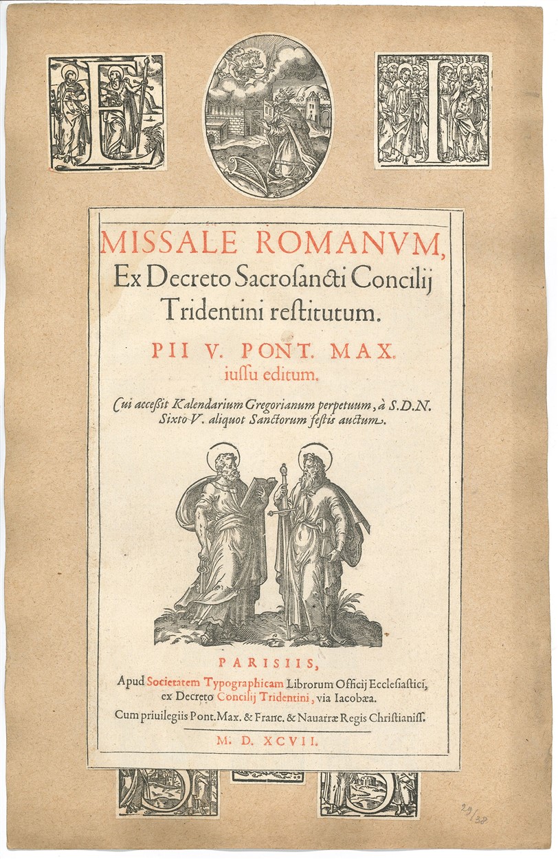 Missale Romanum ex decreto sacrosancti consilii Tridentini restitutum: titelblad en 32 uitgeknipte houtsnedes