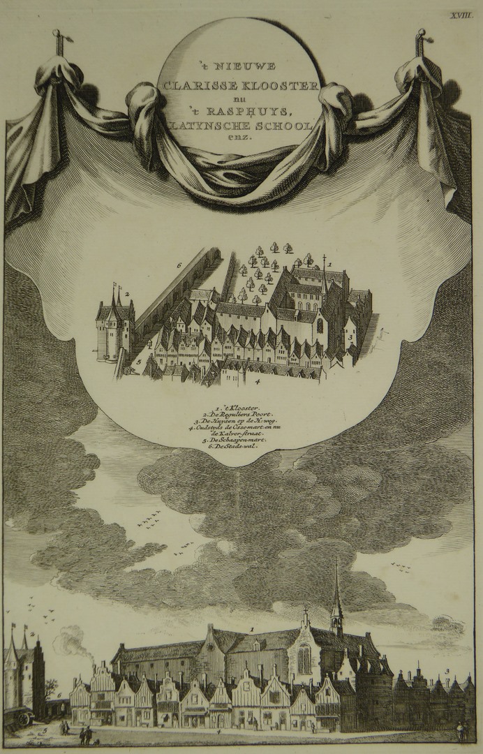 Amsterdam, Nieuwe Clarisseklooster, nu 't Rasphuis, Latijnse school enz. op hoek Kalverstraat