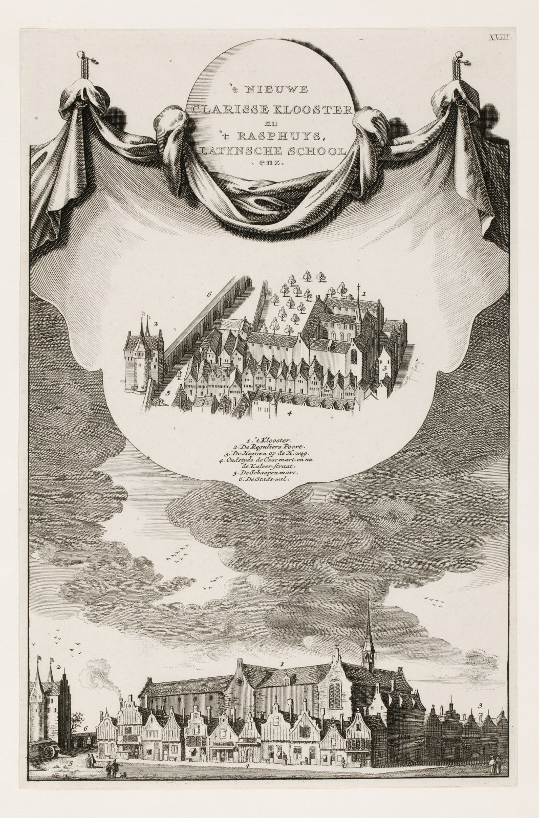 Amsterdam, Nieuwe Clarisseklooster, nu 't Rasphuis, Latijnse school enz. op hoek Kalverstraat