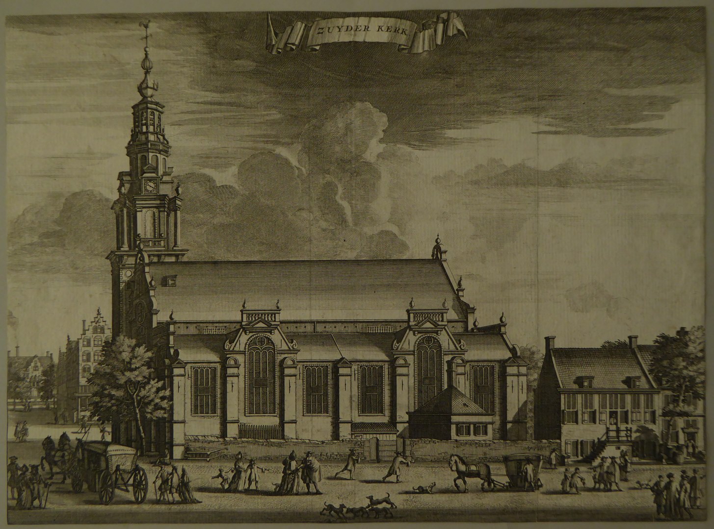 Amsterdam, Zuiderkerk op de voorgrond een groot aantal mensen, koetsen met paarden en honden