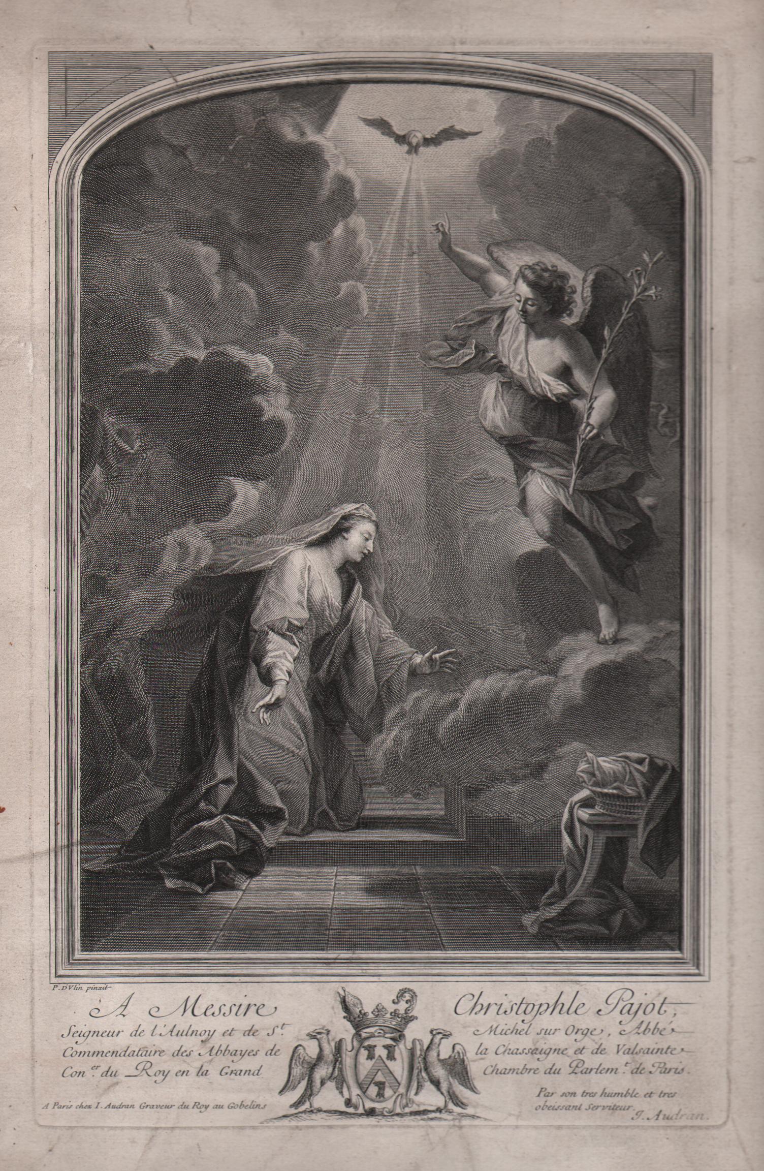 Annunciatie: Links van het midden knielt Maria op een (trap- of knielbank-?)trede. Haar gezicht is gericht naar de rechterzijde van de prent waarop Gabriel binnenvliegt. Maria heeft de ogen neergeslagen en is gekleed in een gewaad dat haar hals zichtbaar laat. Haar hoofd is grotendeels bedekt door een hoofddoek. Zij houdt haar armen, schuin naar ...