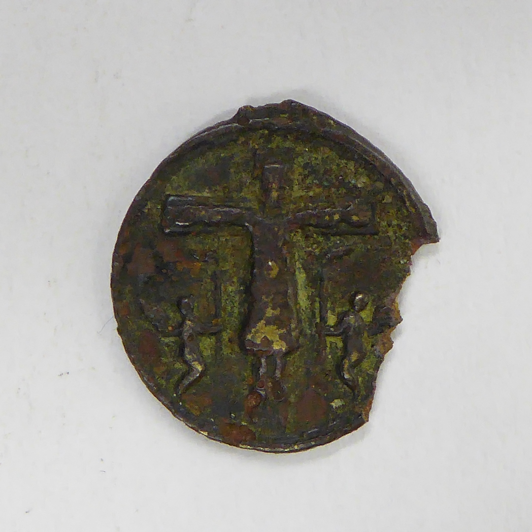 Bedevaartspenning Santa Volta, Lucca, met gekruisigde Christus, kz. Maria tussen olielampen