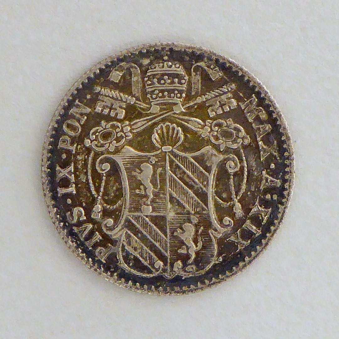 Vijf baiocchi paus Pius IX met wapen, kz. tekst