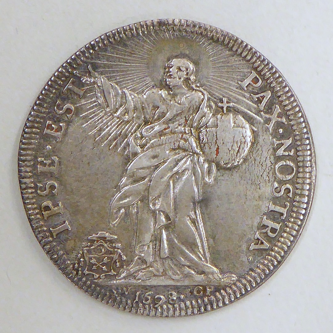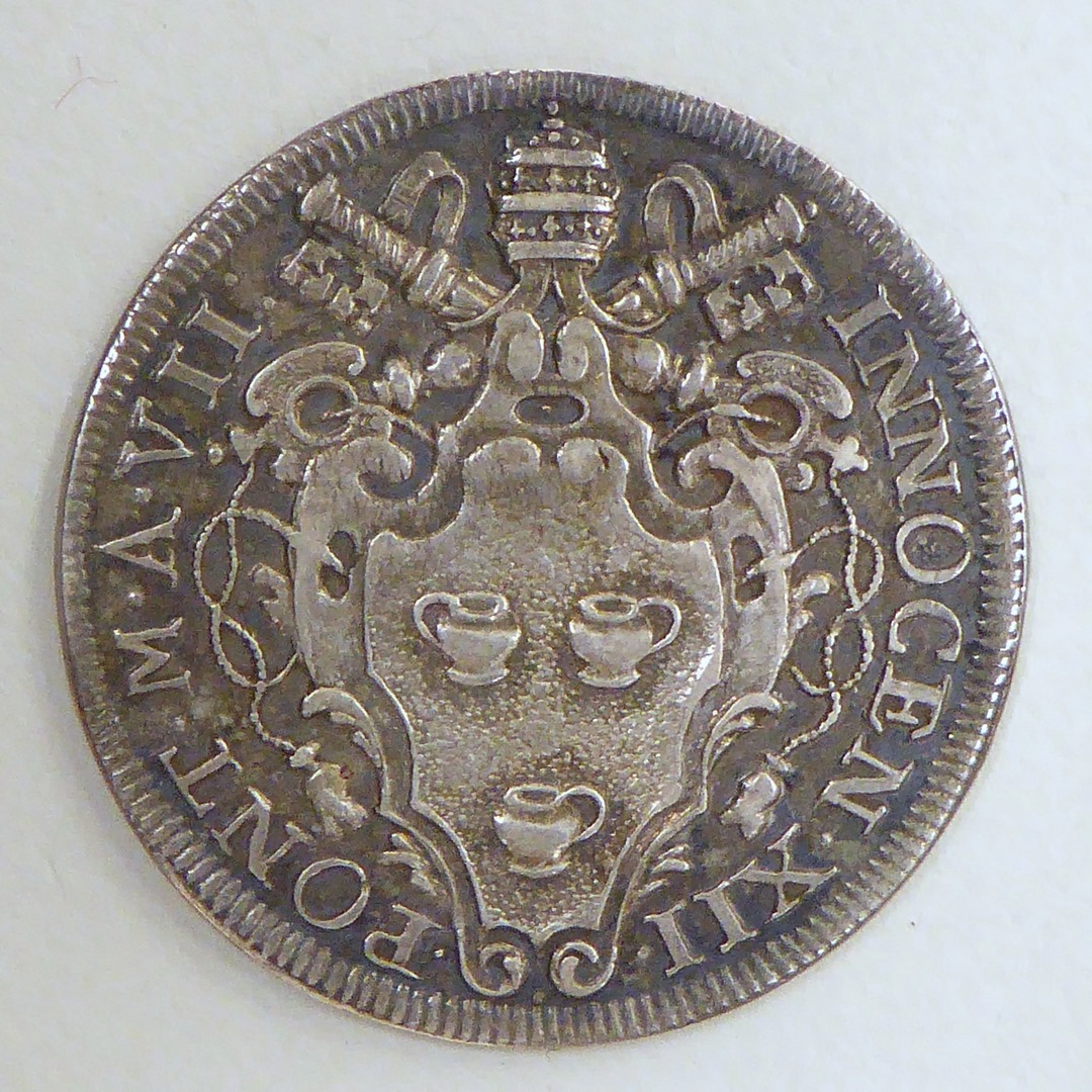 Testone paus Innocentius XII met wapen, kz. Christus met wereldbol
