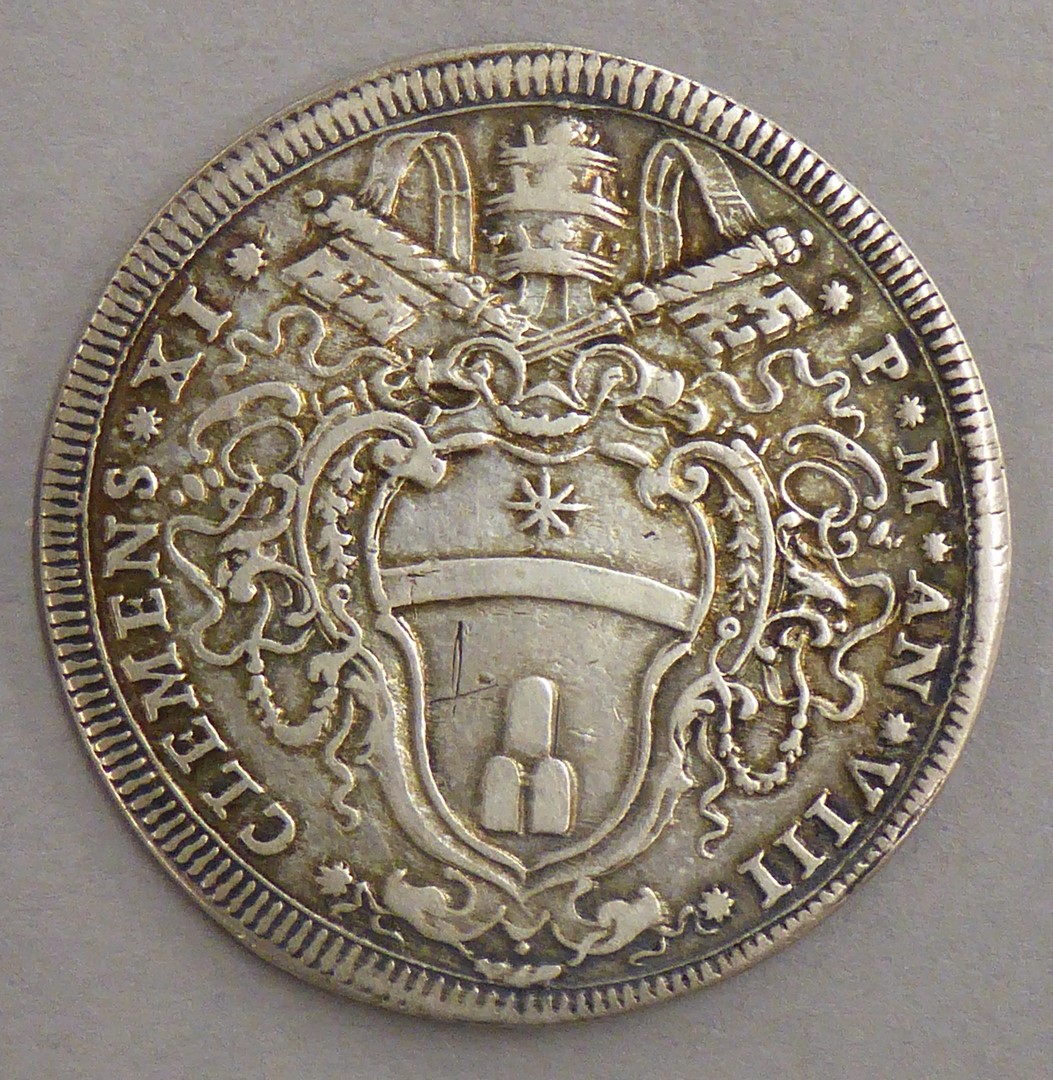 Halve piaster paus Clemens XI met wapen, kz. tekst
