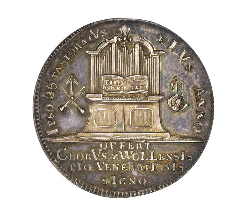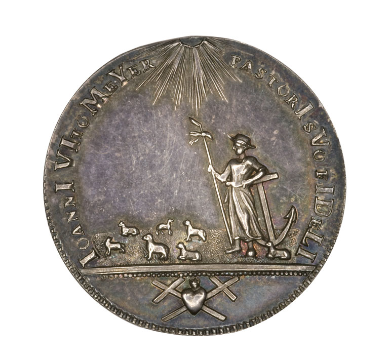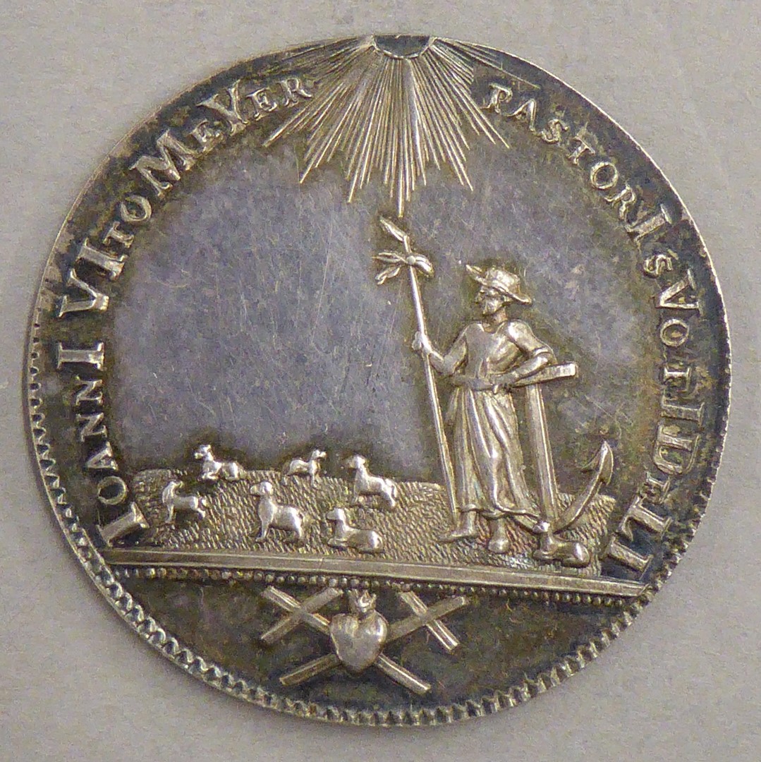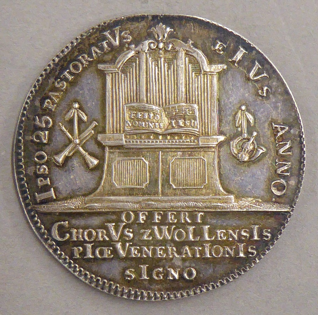 vz.: IOANNI VITO MEVER PASTORI SVO FIDELI kz.: IPSO 25 PASTORATVS EIVS ANNO / OFFERT CHORVS ZWOLLENSIS PIE VENERATIONIS SIGNO (de letters I, V, L, C, D en M in afwijkend formaat)