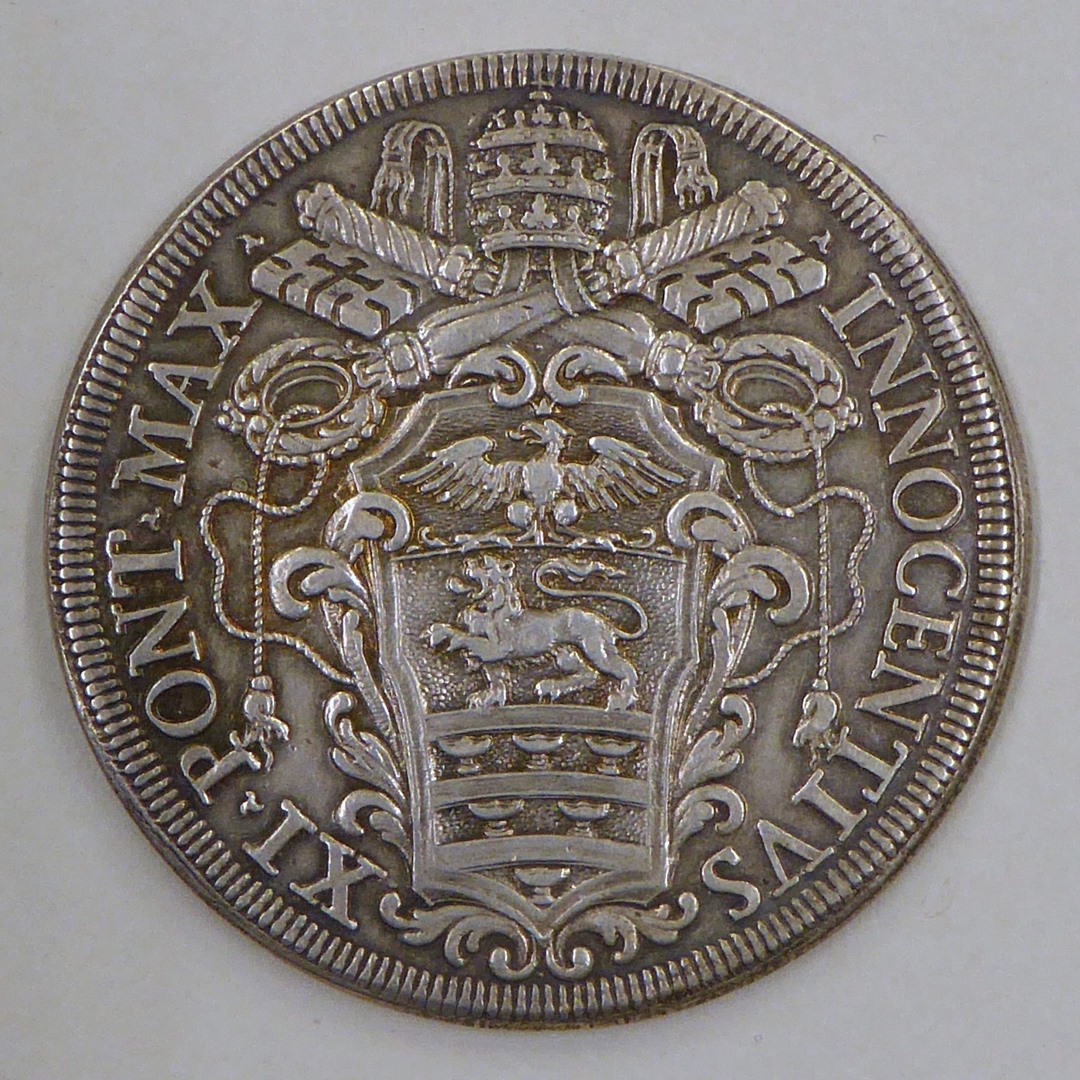 Piaster paus Innocentius XI met wapen, kz. tekst