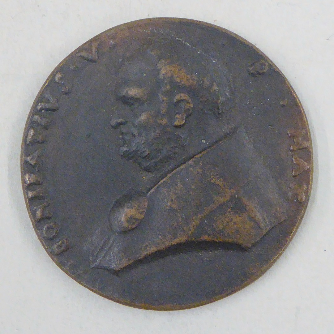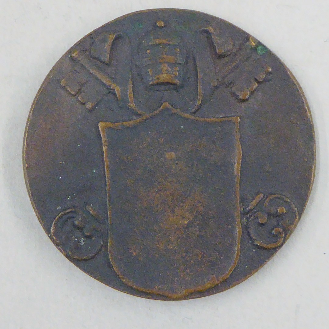 Pauspenning met portret paus Bonifatius V (619-625), gegoten, kz. tiara, sleutels, wapenbord