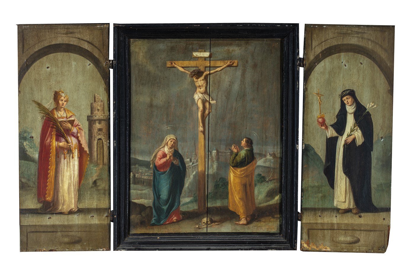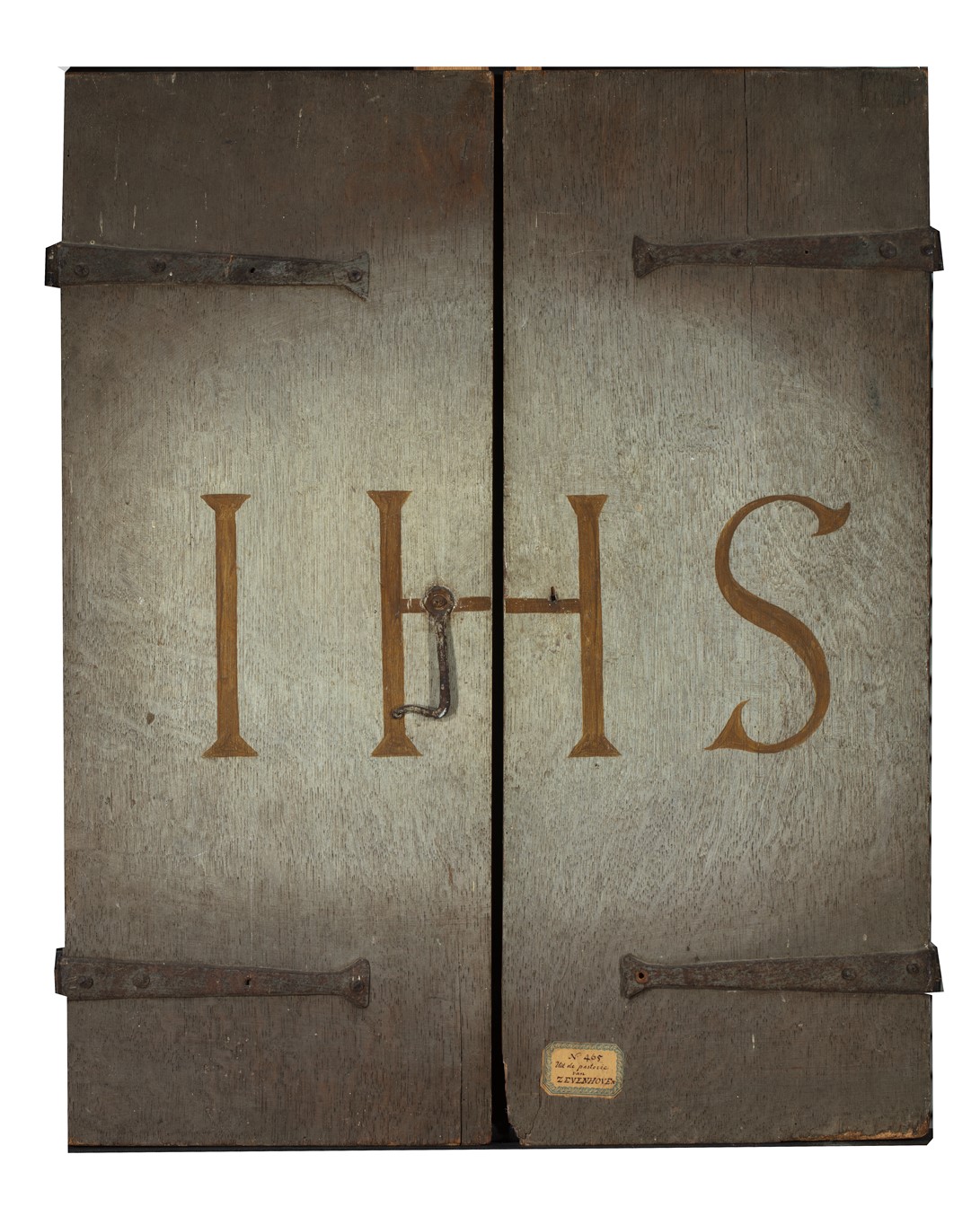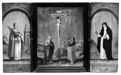 Op het linkerluik Barbara, op het rechterluik Catharina van Siena. Op de buitenzijde, verdeeld over beide zijluiken, het Jezusmonogram: IHS.