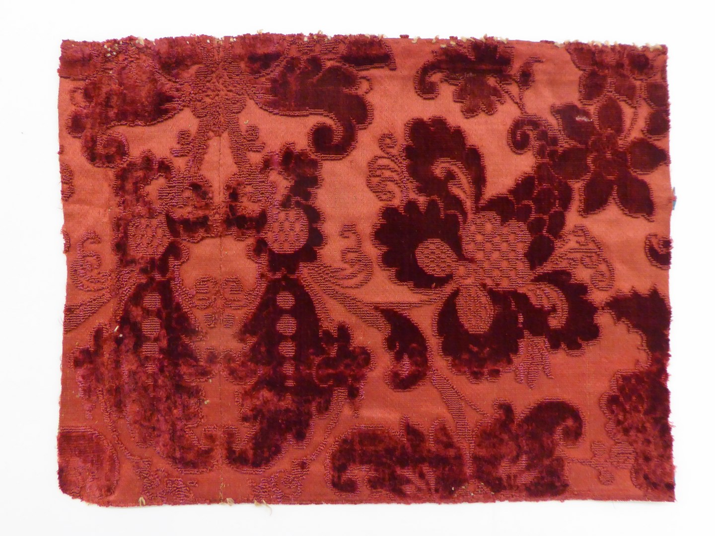 Op de satijnen ondergrond staan allerhande planten- en bloemenmotieven in hooggesneden polen. Om de bloemvormen te accentueren lusjes-pool techniek toegepast. Grond: kettingsatijn. Motief: gesneden polen en ongesneden polen (velours ciselé).