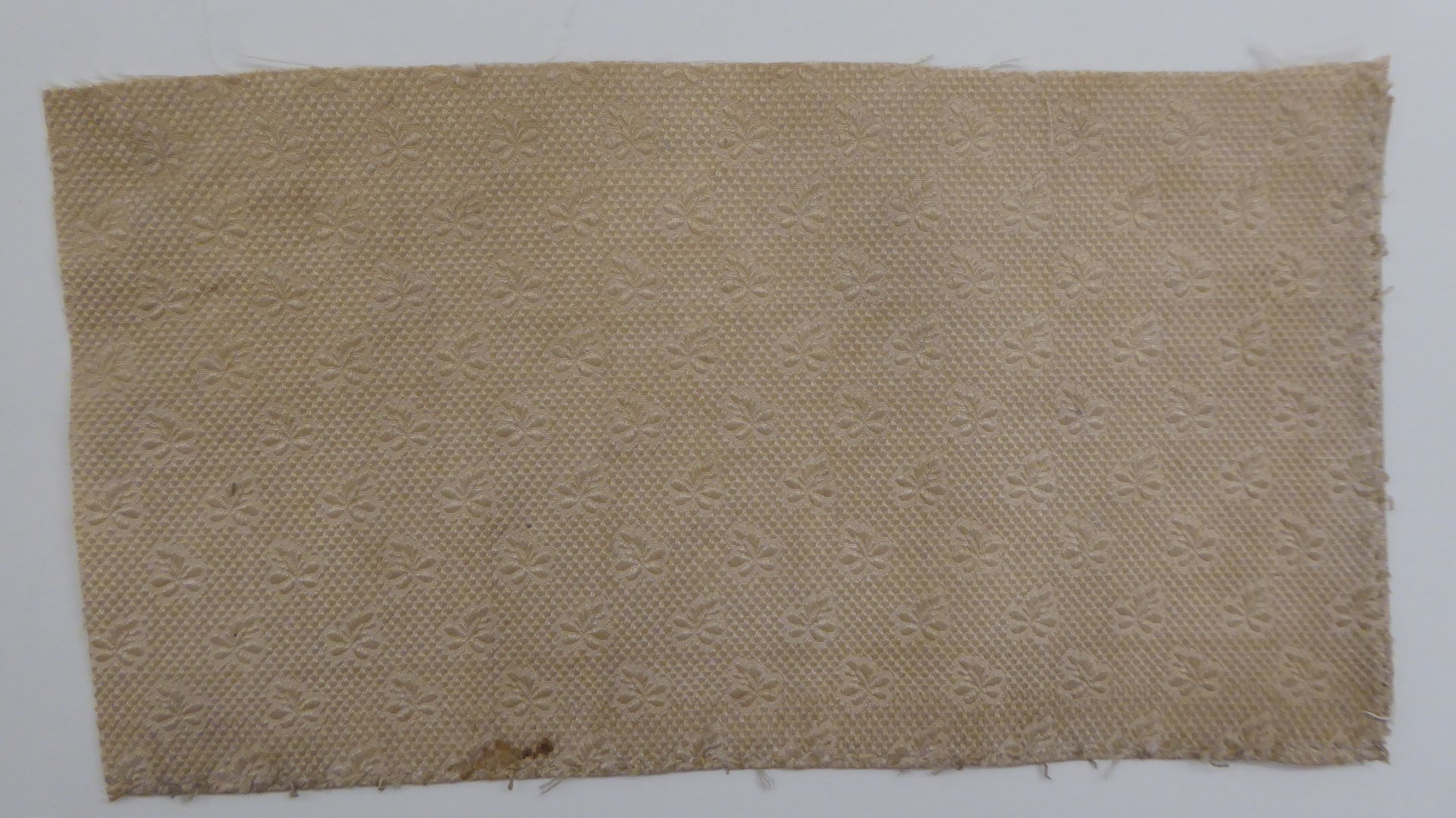 In de witte zijden achtergrond van het fragment zijn in een ruitvormig patroon eikenblaadjes geweven, die afwisselend naar links en rechts gebogen zijn. Grond: zijde in platbinding. Motief: zijde in kettinglancé.