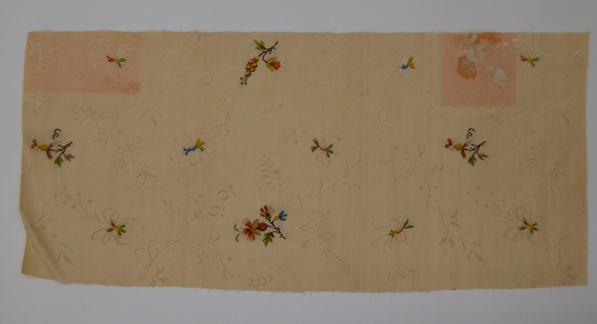 Op het zijden weefsel zijn witte (oorspronkelijk roze) blad- en bloementuiltjes geweven op een wit fond. Daar tussen in gekleurde strooibloemen. Grond: zijde in linnenbinding, flotterende ketting. Motief: de bloemen zijn gebrocheerd, inslaglancé van witte (oorspronkelijk roze) zijde.