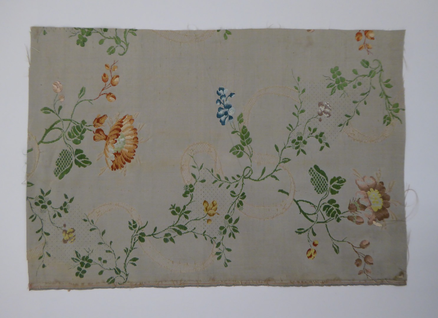 In het zijden weefsel zijn op een grijs fond kleurige bloementuiltjes verwerkt. Daartussen een slingerende band. Tussen twee van de banden is de achtergrond gespikkeld. Grond: Gros de Tours (canneléweefsel). Motief: de bloementuilen in gebrocheerde zijde. De banden zijn in grondschot (liseré).