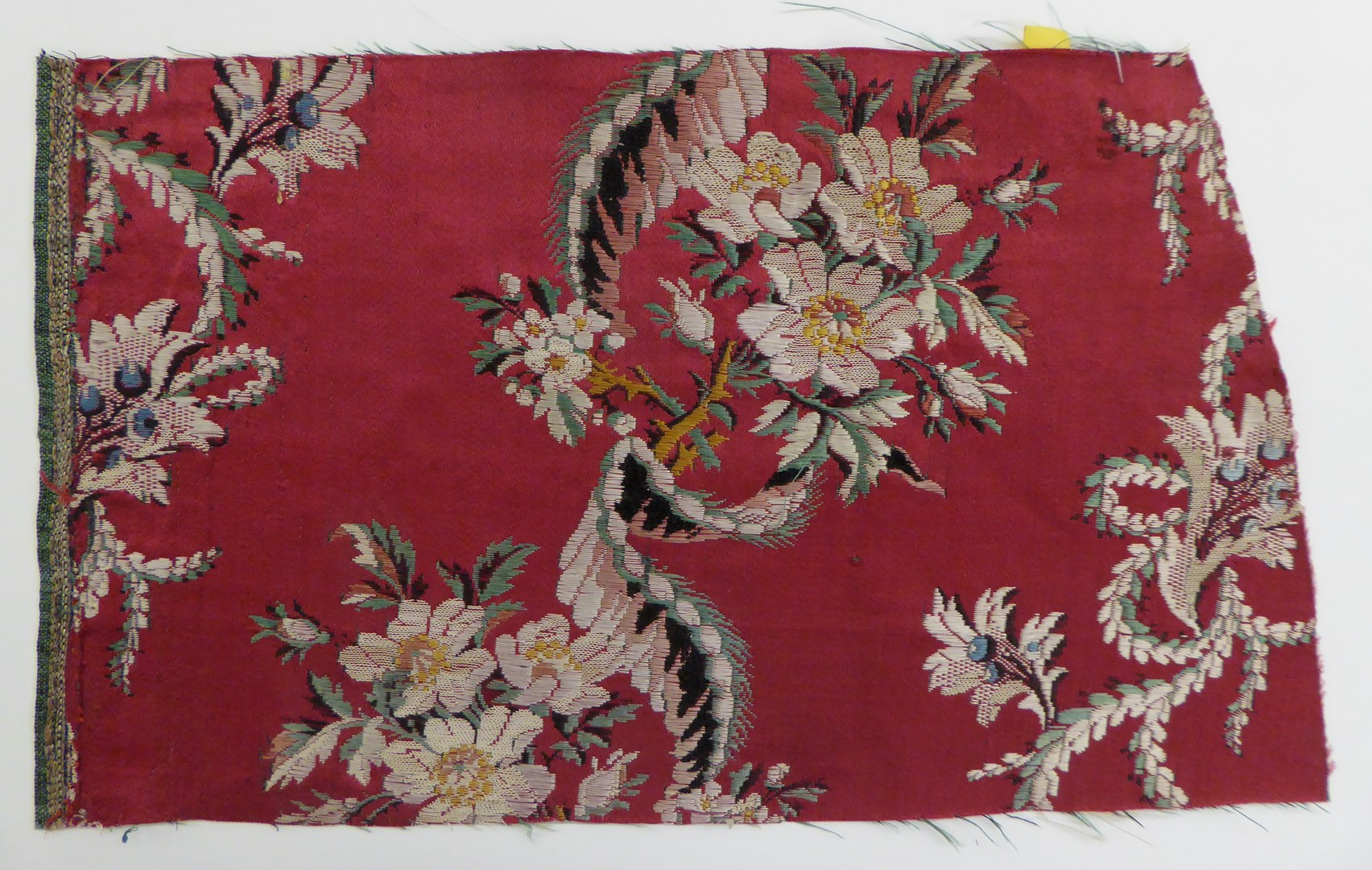 Op een rozerood lampasweefsel worden slingerende bloem- en bladranken afgebeeld. Techniek: de grond is in kettingsatijn geweven, waarin de bloemenmotieven gebrocheerd zijn; atlas liseré in groen/grijs en zwart.