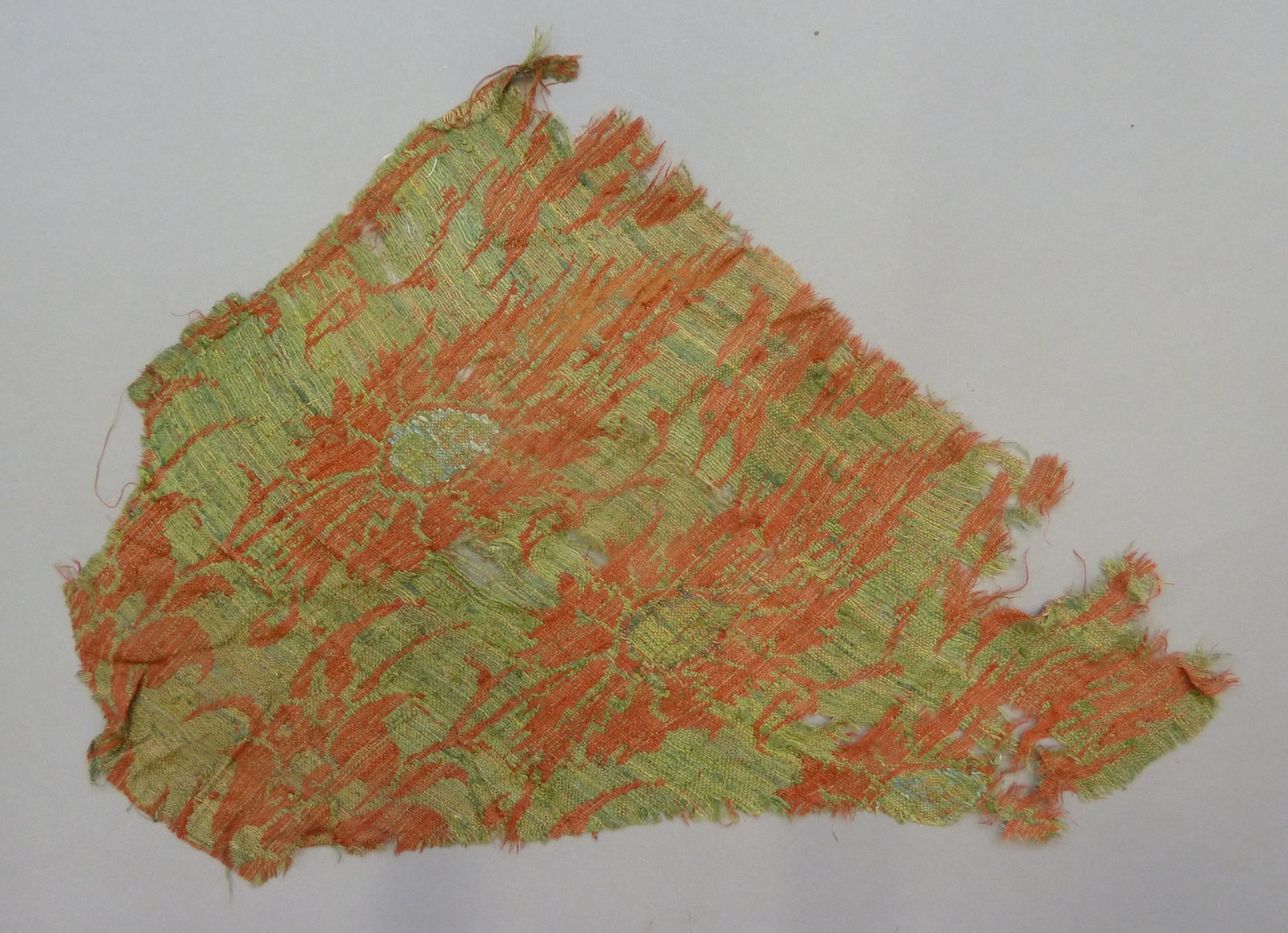 In het luchtige, dunne fragment zijn bloemen- en granaatappelmotieven geweven. De grond is in kettingsatijn, De motieven zijn in platbinding, gebonden door een extra ketting (bindende ketting of Bindekette). De granaatappels zijn gebrocheerd.