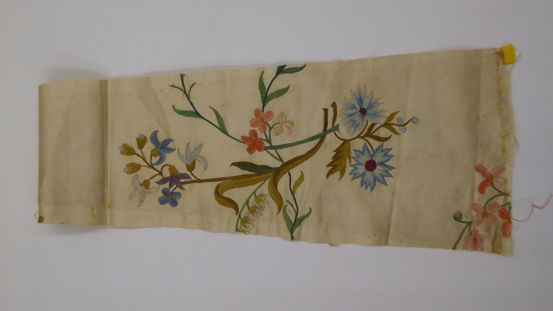 Wit zijdeweefsel met borduurwerk van bloemen en bladwerk
