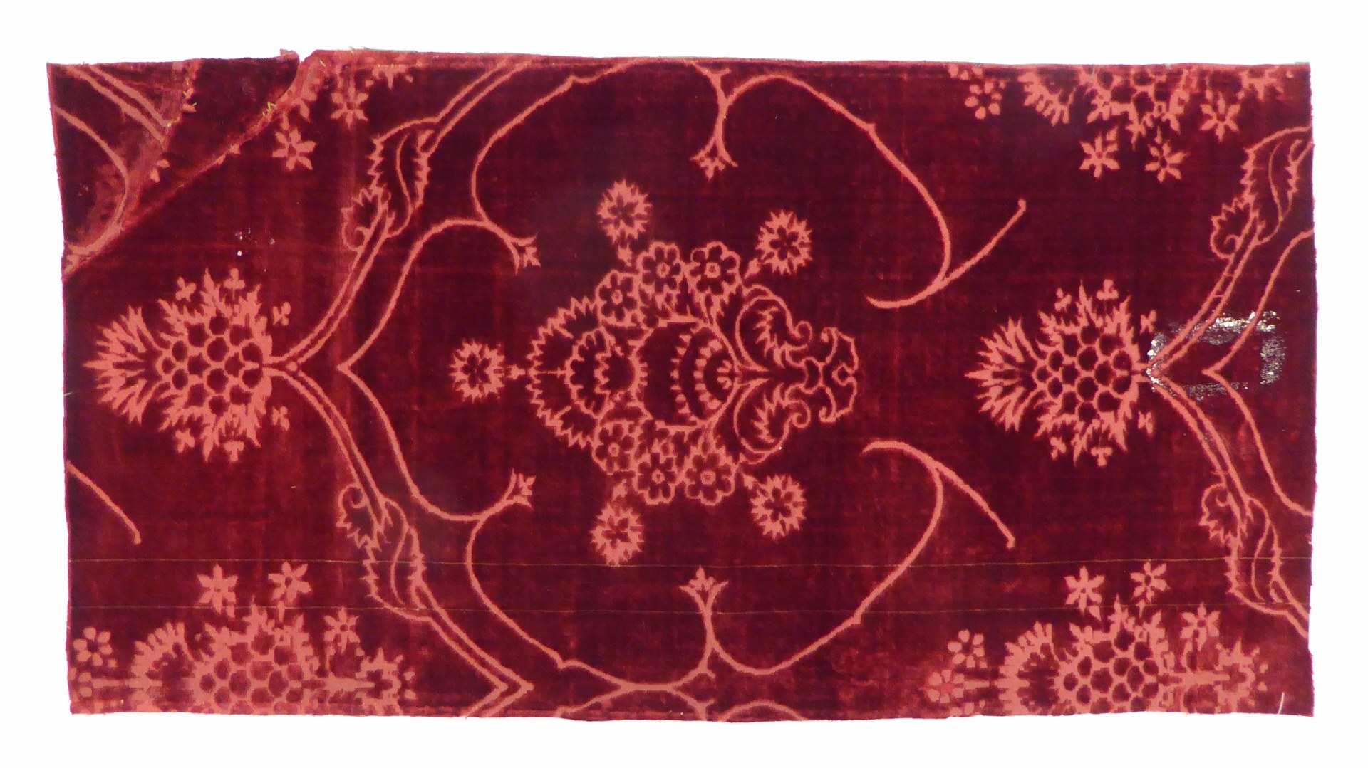 Op een wijnrood fond van zijdefluweel staat een dubbele rij van vijfmaal gewelfde rosetten, in het midden van het veld een granaatappelbloesem. De motieven worden omlijst door fijn gelijnde bogen. Techniek: de grond is in geschoren poolfluweel, de uitgespaarde motieven in kettingsatijn.