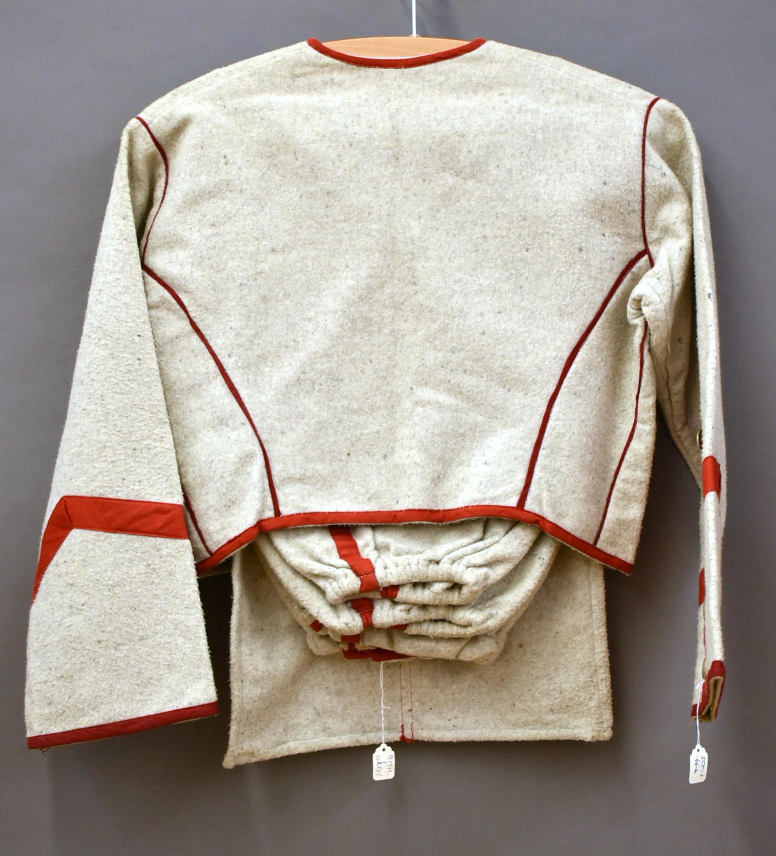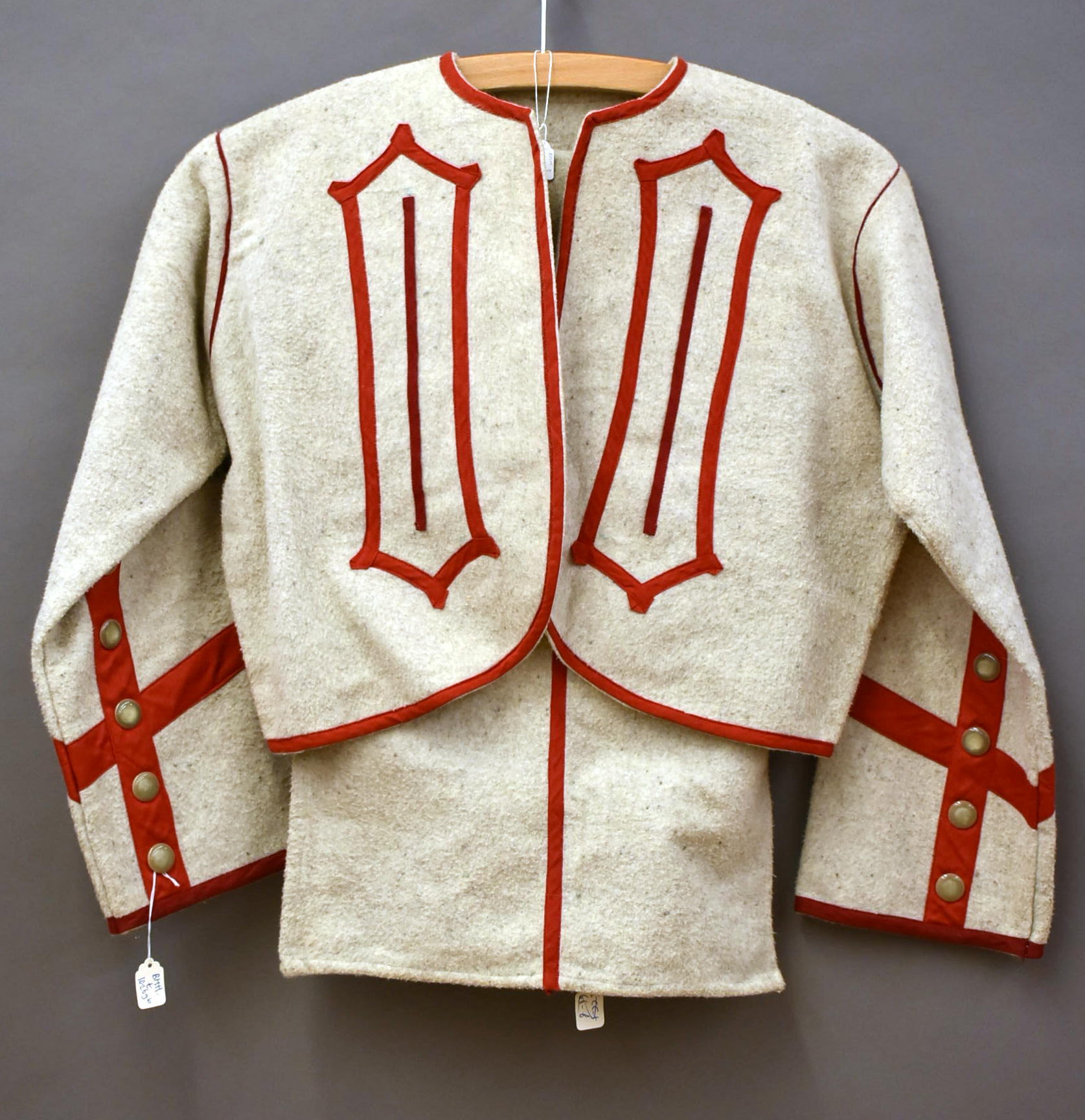 Kleding kindsheid, grijs zouavenjasje, rood afgebiesd