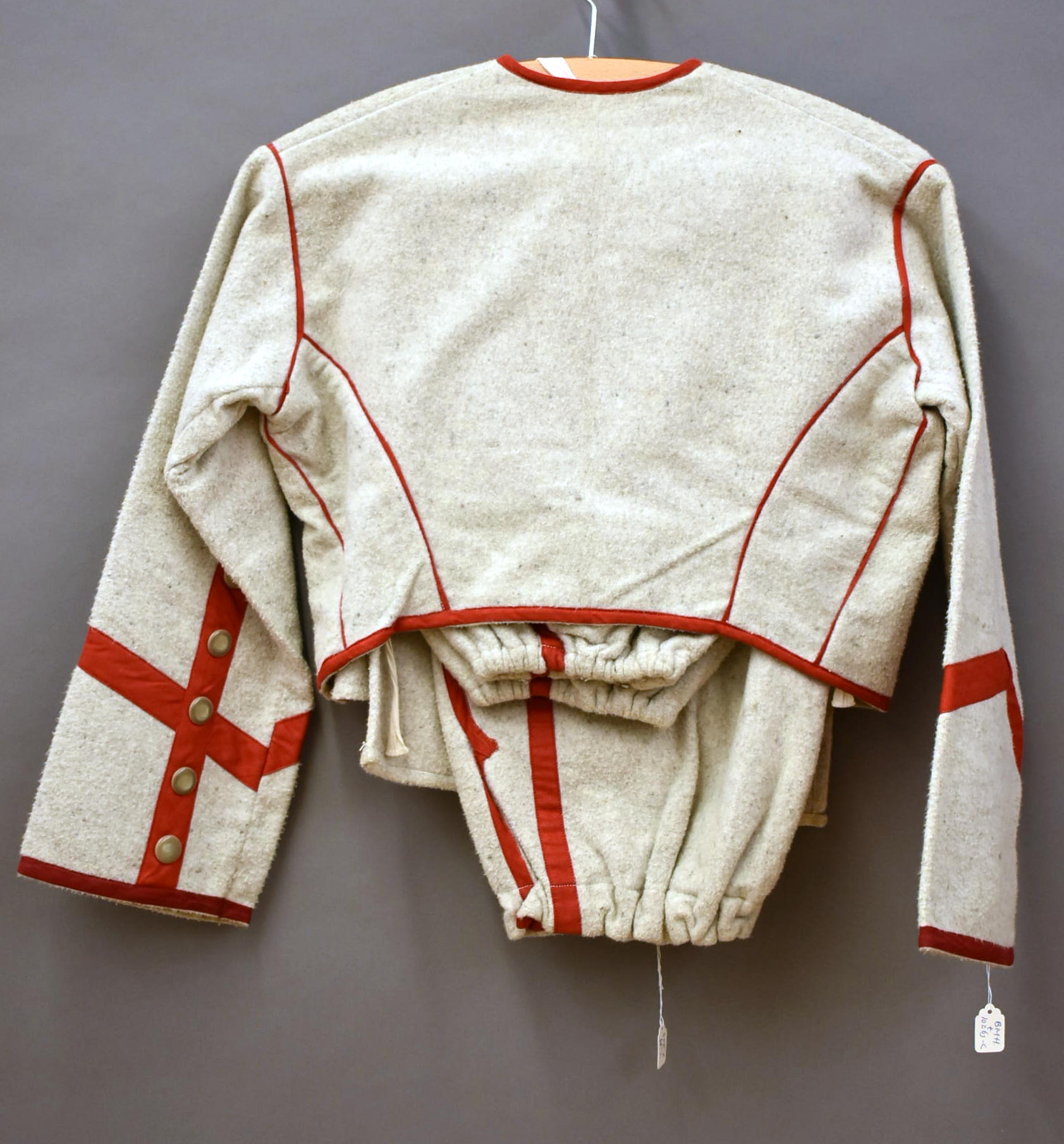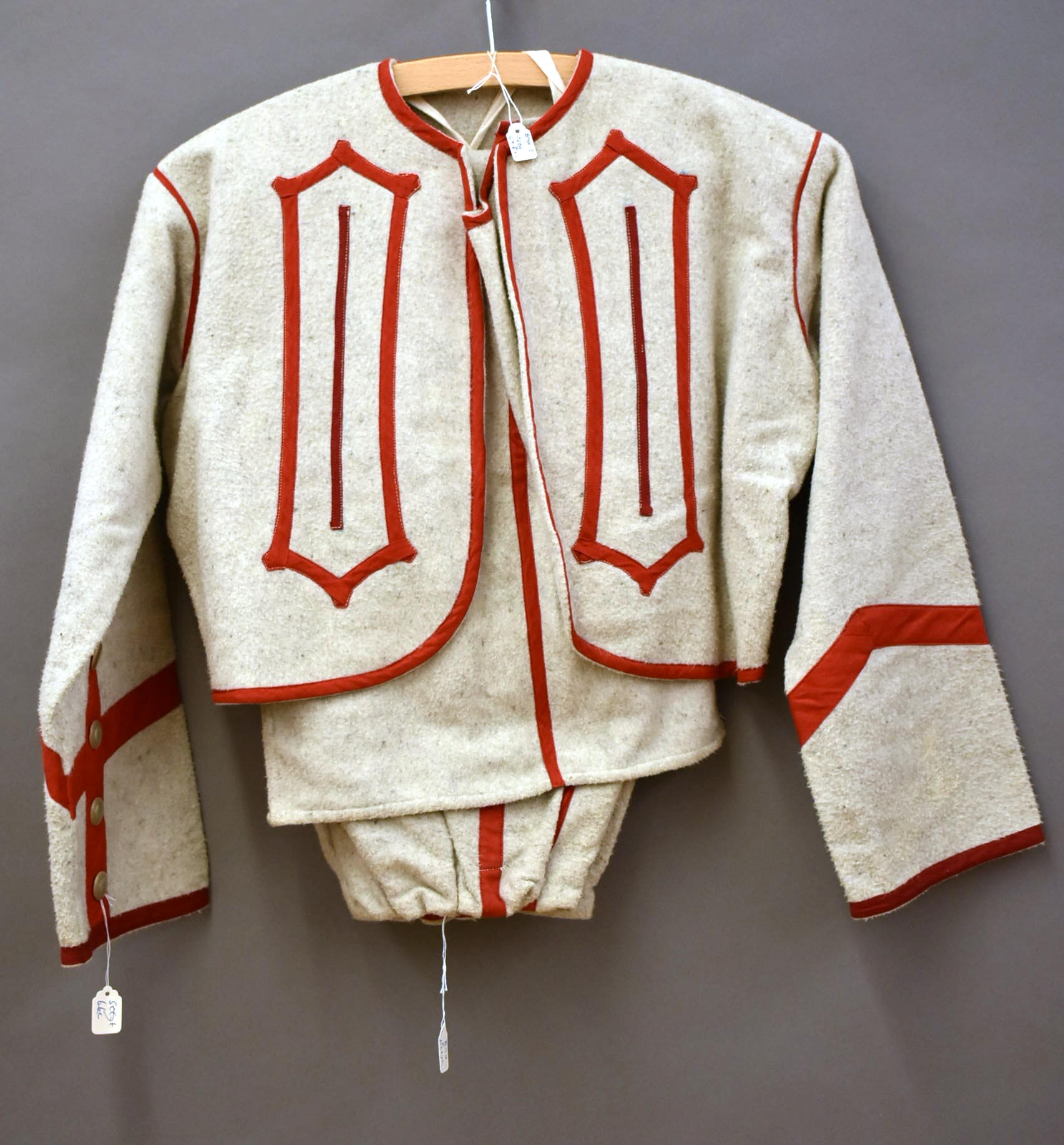 Kleding kindsheid, grijs zouavenjasje, rood afgebiesd