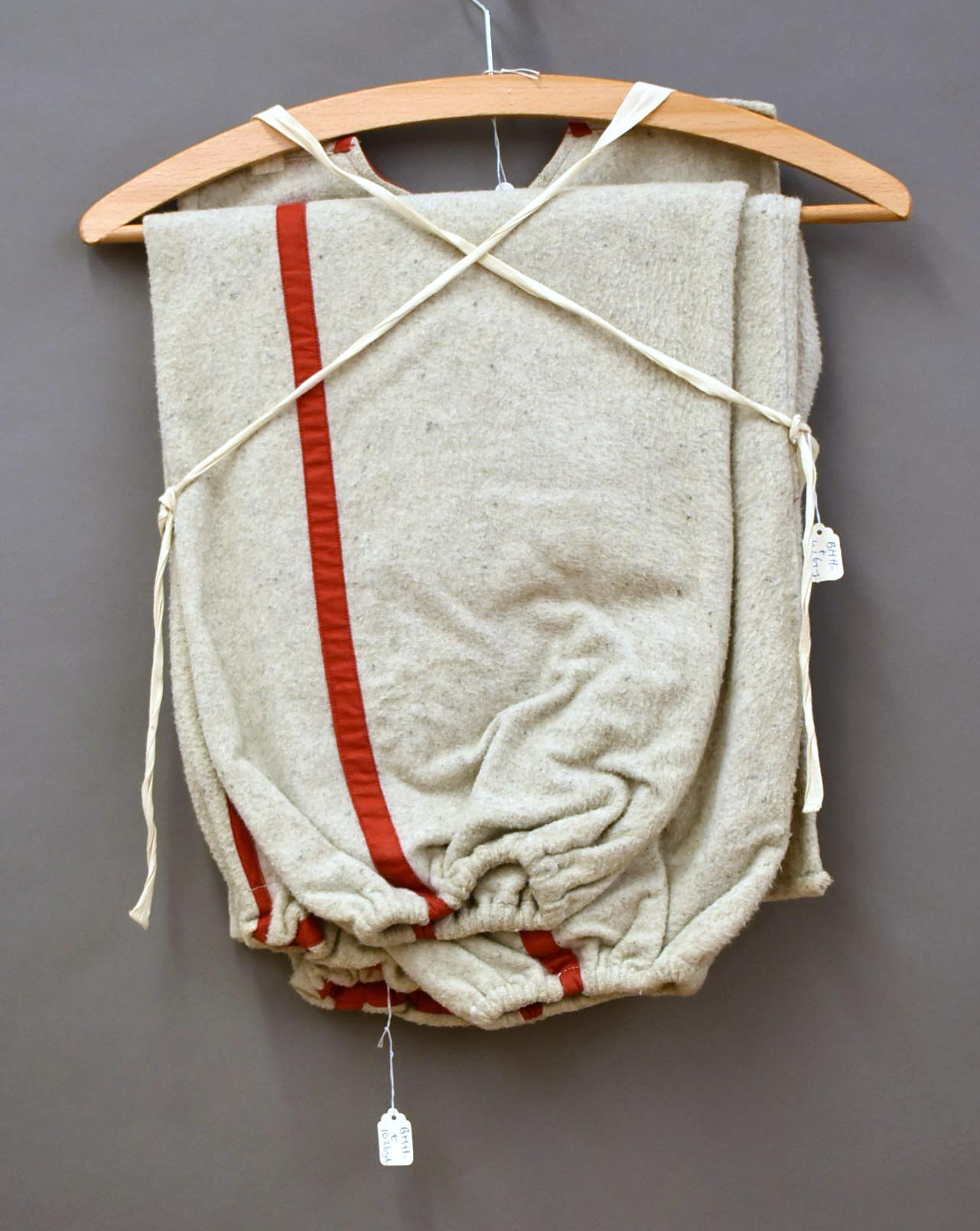 Kleding kindsheid, grijze wijde zouavenbroek, rood afgebiesd