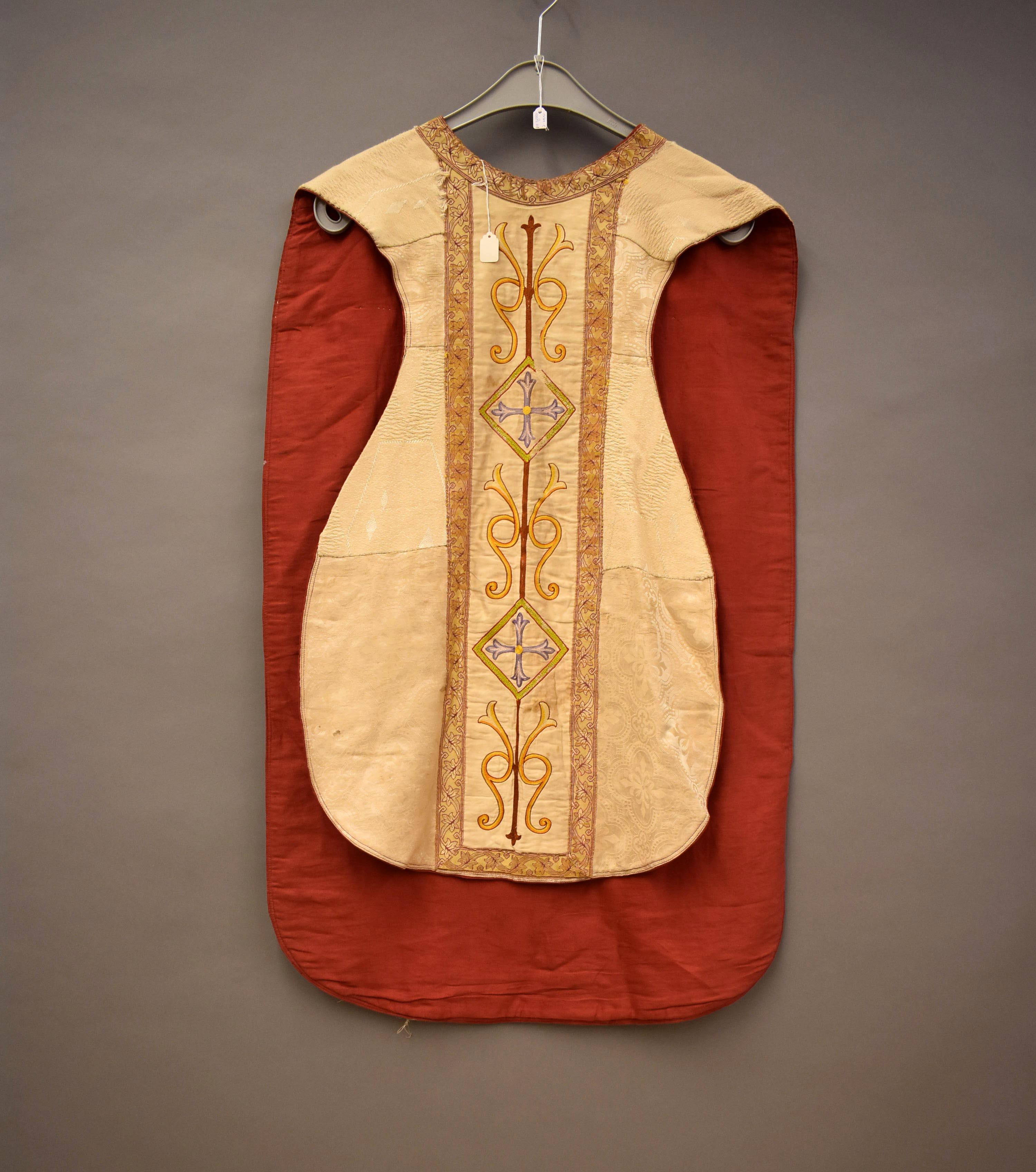 Kleding kindsheid, crème kazuifel met ingeweven vierpassen met bloemmotief, galon, achter IHS