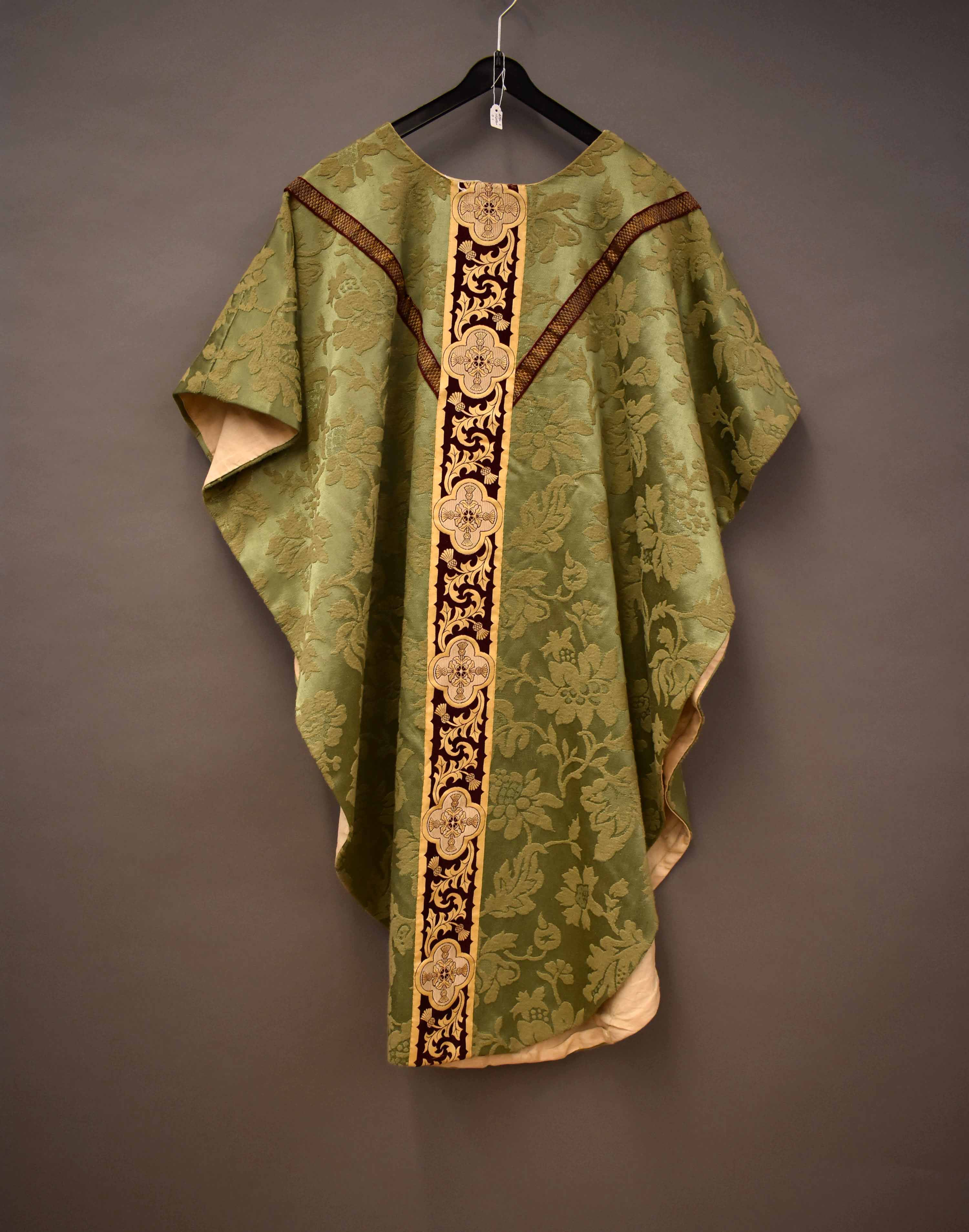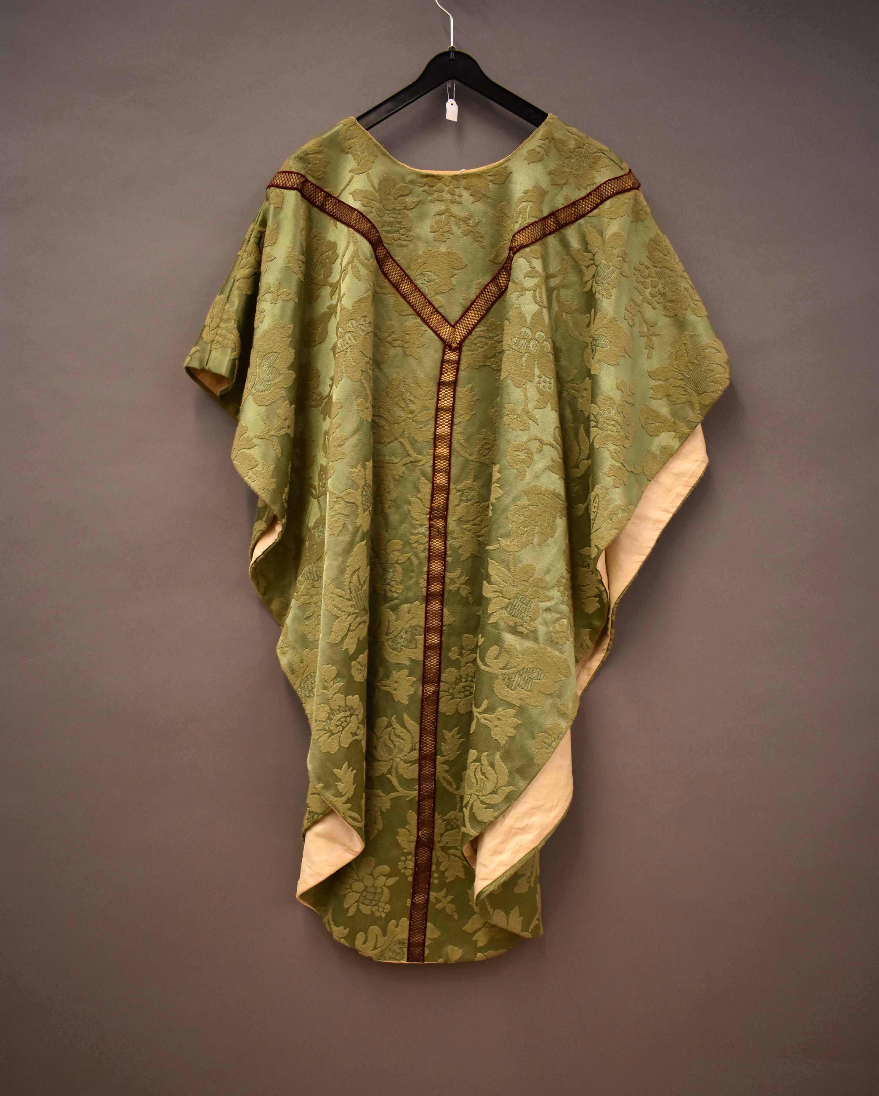 Kleding kindsheid, groen kazuifel met ingeweven velours bloempatroon, beige voering
