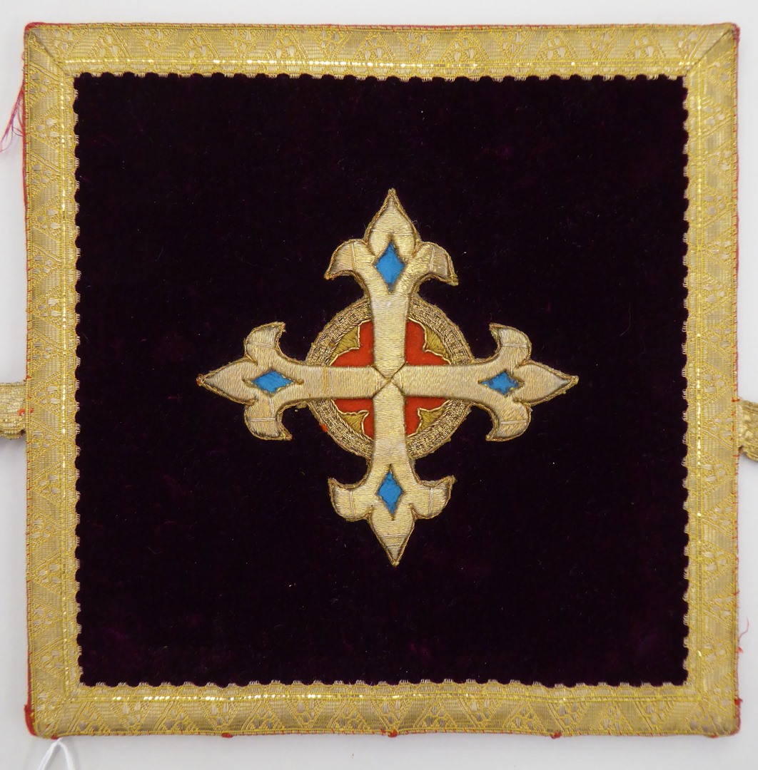 Donkerrode beurs met leliekruis van gehoogd gouddraad in rode kruisnimbus