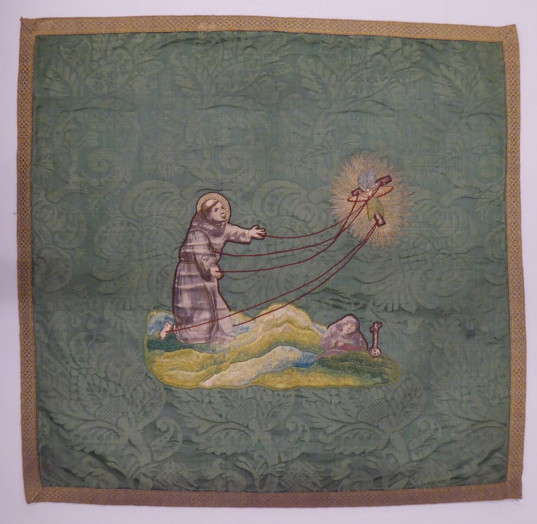 Groen kelkvelum met ingeweven granaatappelpatroon en met St. Franciscus