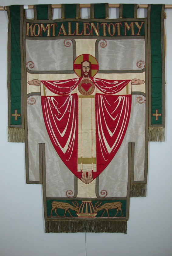 Vaandel met gekruisigde Christus, twee drinkende herten en "Komt allen tot Mij"