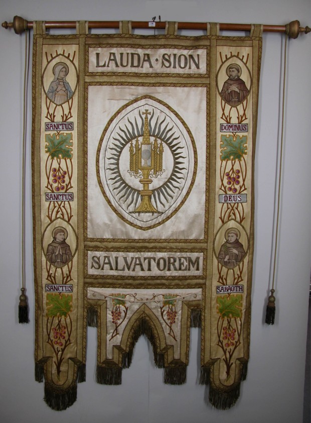 Vaandel met monstrans in mandorla, Franciscus, Maria en twee franciscanen en "Lauda Sion"