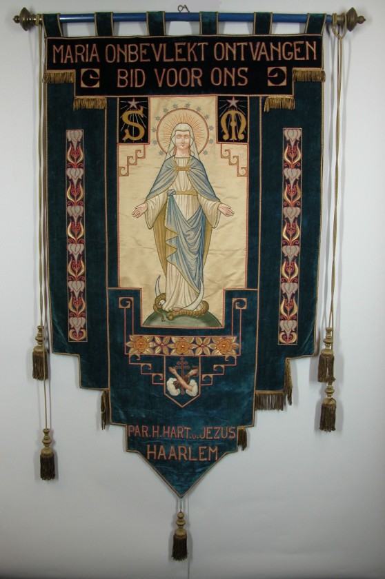 Blauw vaandel met Maria op maansikkel, slang vertrappend en "Maria onbevlekt ontvangen ..."