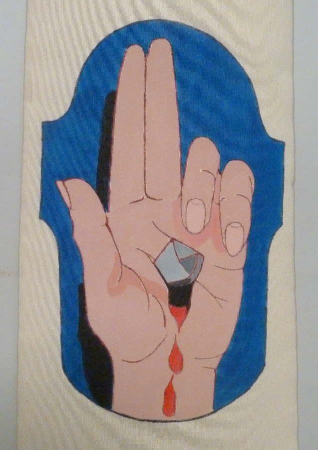 Witte preekstola(?) aan uiteinden beschilderd met hand van Christus met nagel waaronder twee bloeddruppels. Aan de stola is met vijf clips een wit linnen halsdoekje bevestigd.