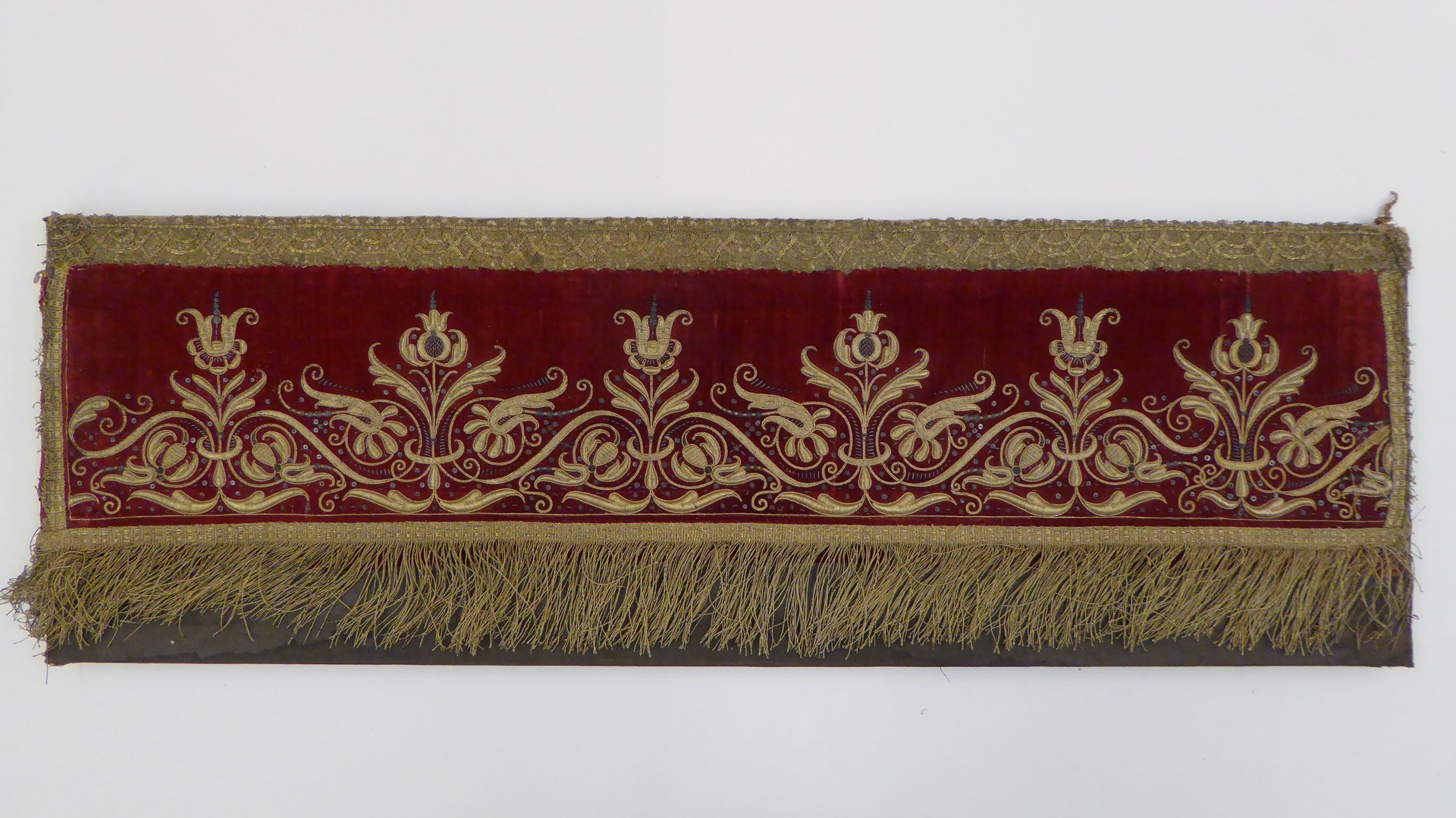 Rode altaarvoorzet met gehoogde florale motieven