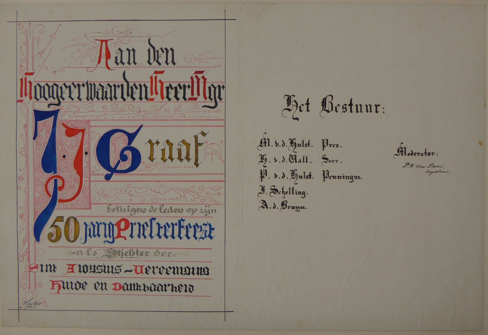Oorkonde in neogotische stijl met gekleurde initialen ter gelegenheid van het gouden priesterfeest van Mgr. Jacobus Joannes Graaf, aan hem geschonken door de Aloysiusvereniging waarvan hij de stichter was