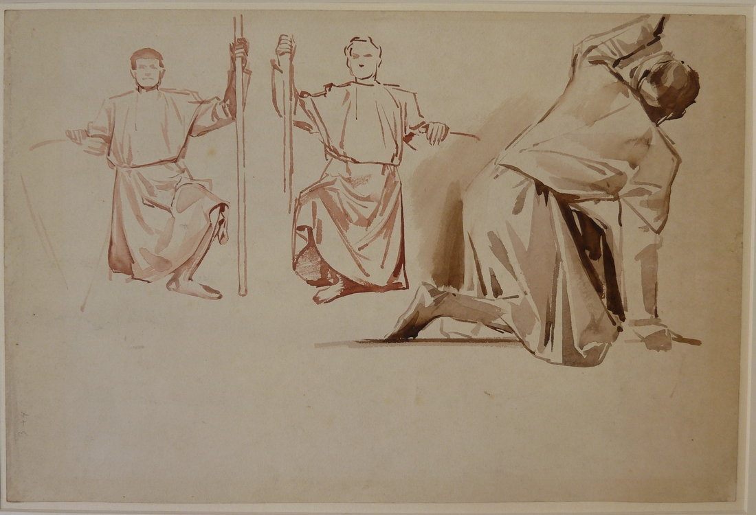Drie knielende figuren met staf, kz. knielende figuur op houten stelling