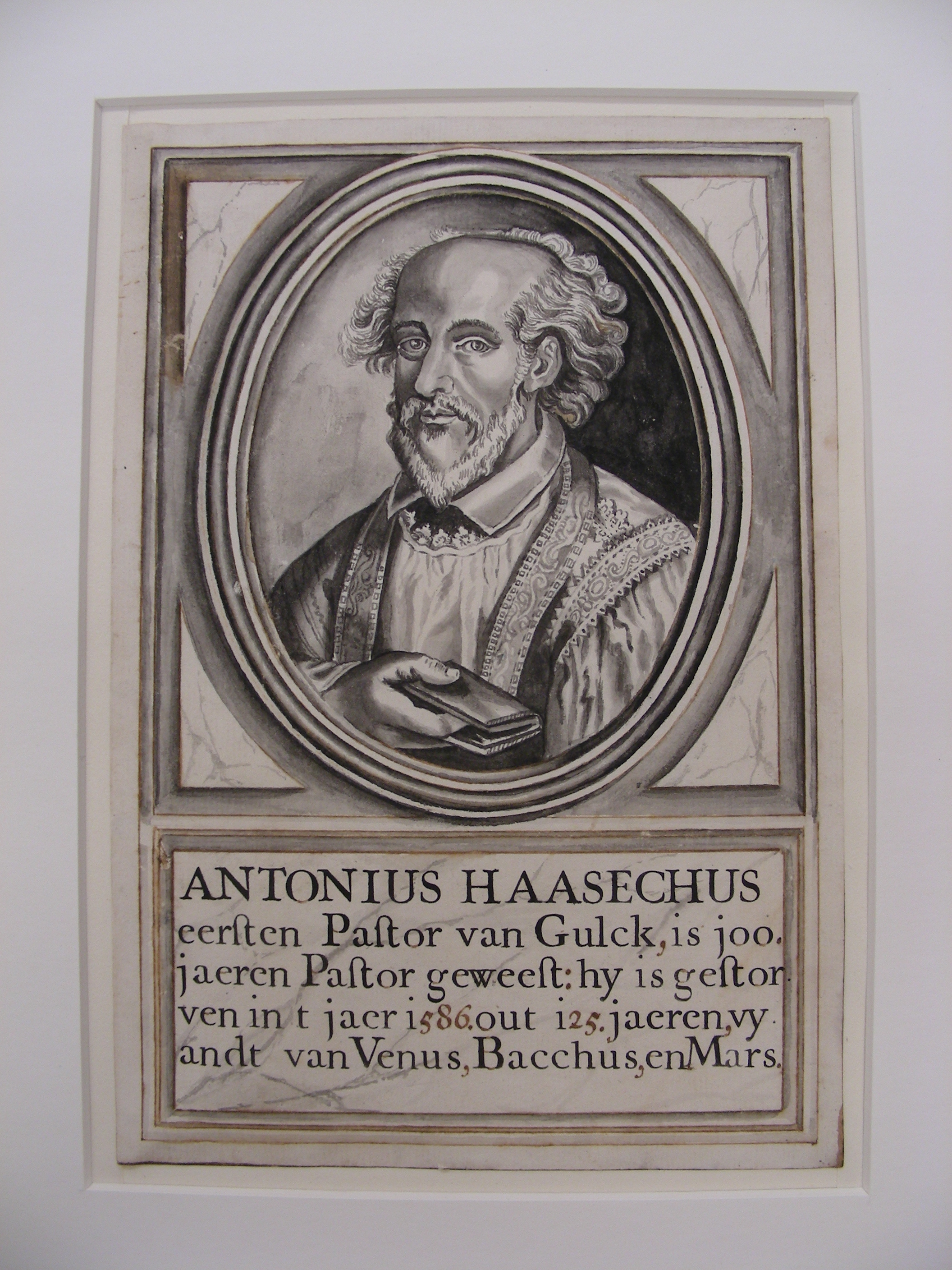 Portret pastoor Anton Hasech. Onder het portret de tekst: Antonius Haasechius eersten Pastor van Gulck, is 100 jaeren Pastor geweest: hy is gestorven in t jaer 1586. out 125 jaeren, vyandt van Venus, Bacchus, en Mars.