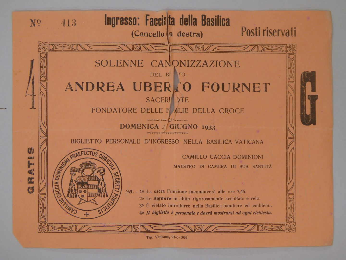 Entreebewijs voor heiligverklaring Andrea Uberto Fournet, op zondag 4 juni 1933