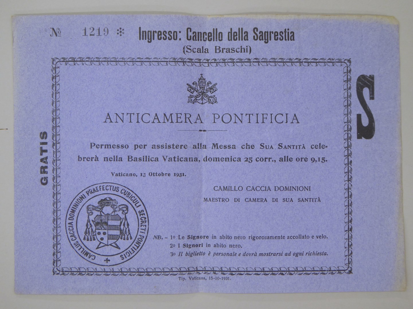 Toestemming bijwonen mis door Zijne Heiligheid in de Basiliek, zondag 25 oktober, 1931, paars