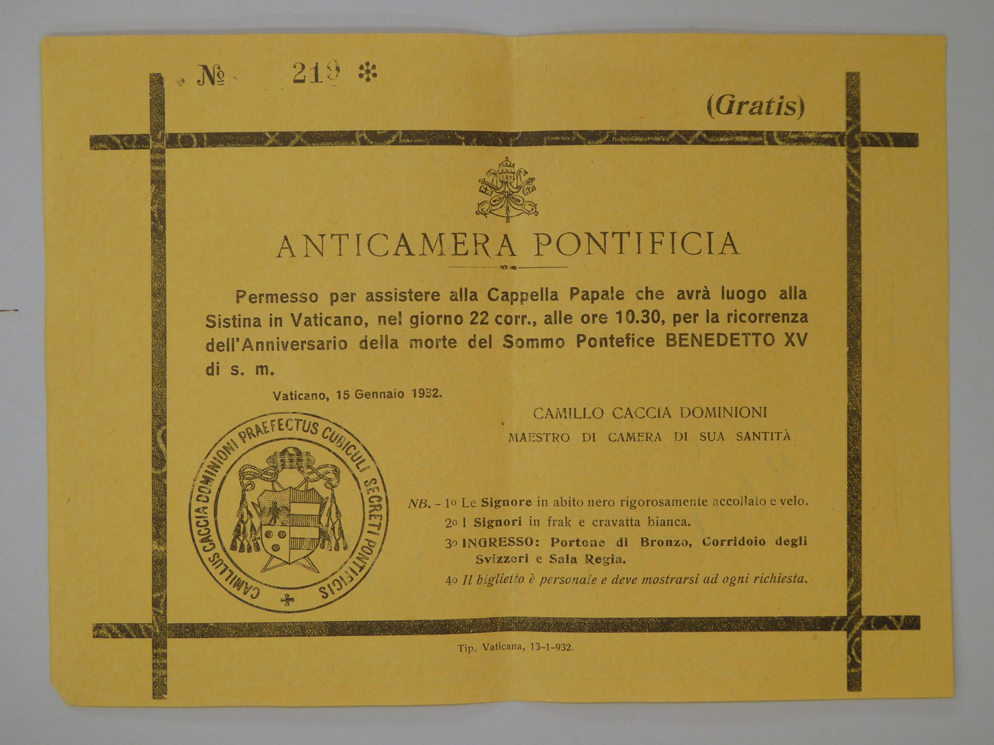 Toestemming bijwonen jubileum sterfdag Benedictus XV, 22 januari, 1932, geel