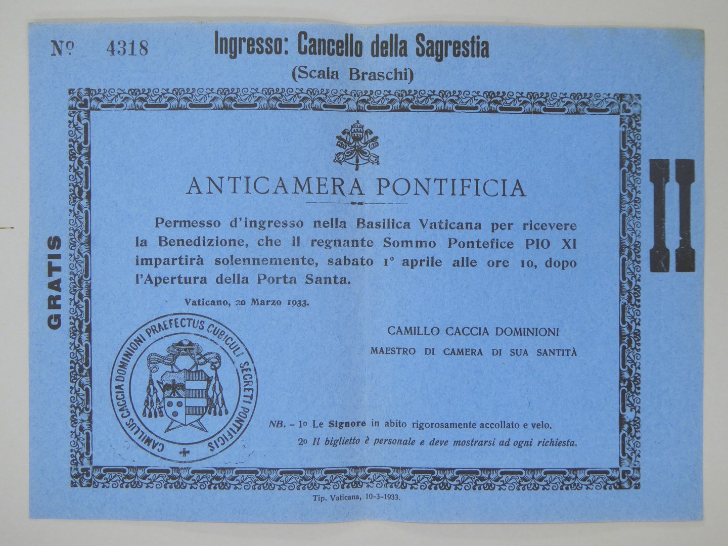 Toegangsbewijs voor St. Pieter om plechtige Zegen te ontvangen door Z.H. Pius XI, zat. 1 april 1933