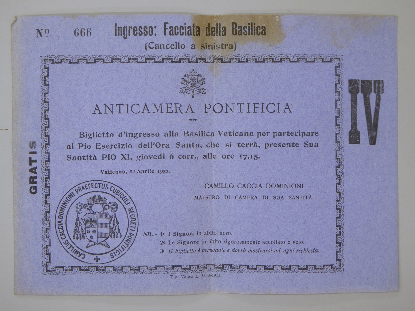 Toegangsbewijs voor St. Pieter, deelneming aan vrome oefening van het heilig uur, donderdag 6 apr.