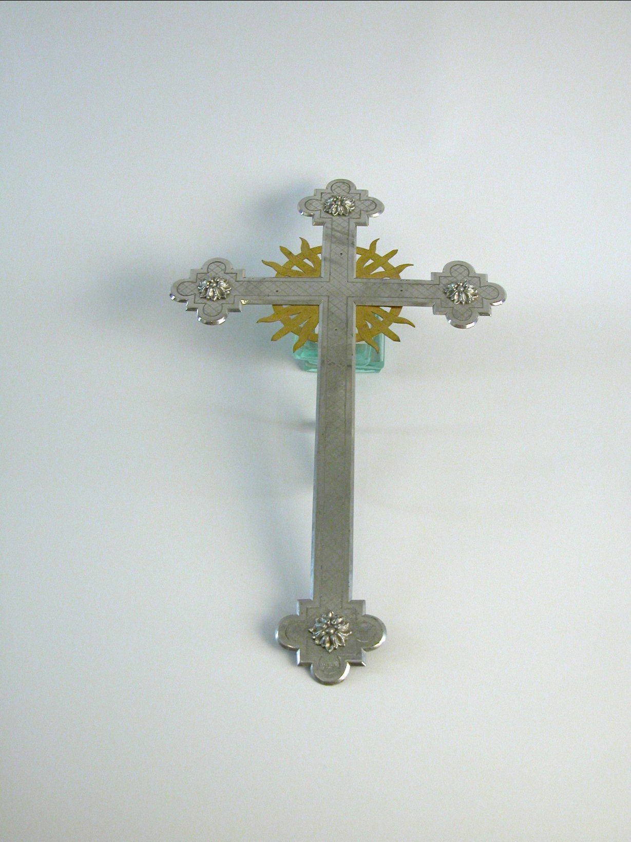 Processieattribuut: metalen kruis met geelkoperen stralenkrans, met handvat aan achterzijde