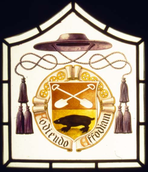 Wapen van Mgr. Jacobus Joannes Graaf, bovenin twee gekruiste 'schoppen', onder een gravende mol, met wapenspreuk "Fodiendo Effodiam"