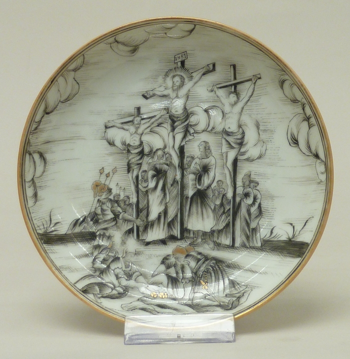 Servies, 36-delig, waarop voorstelling van calvarie, schotel