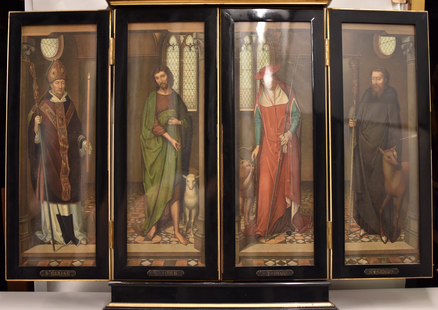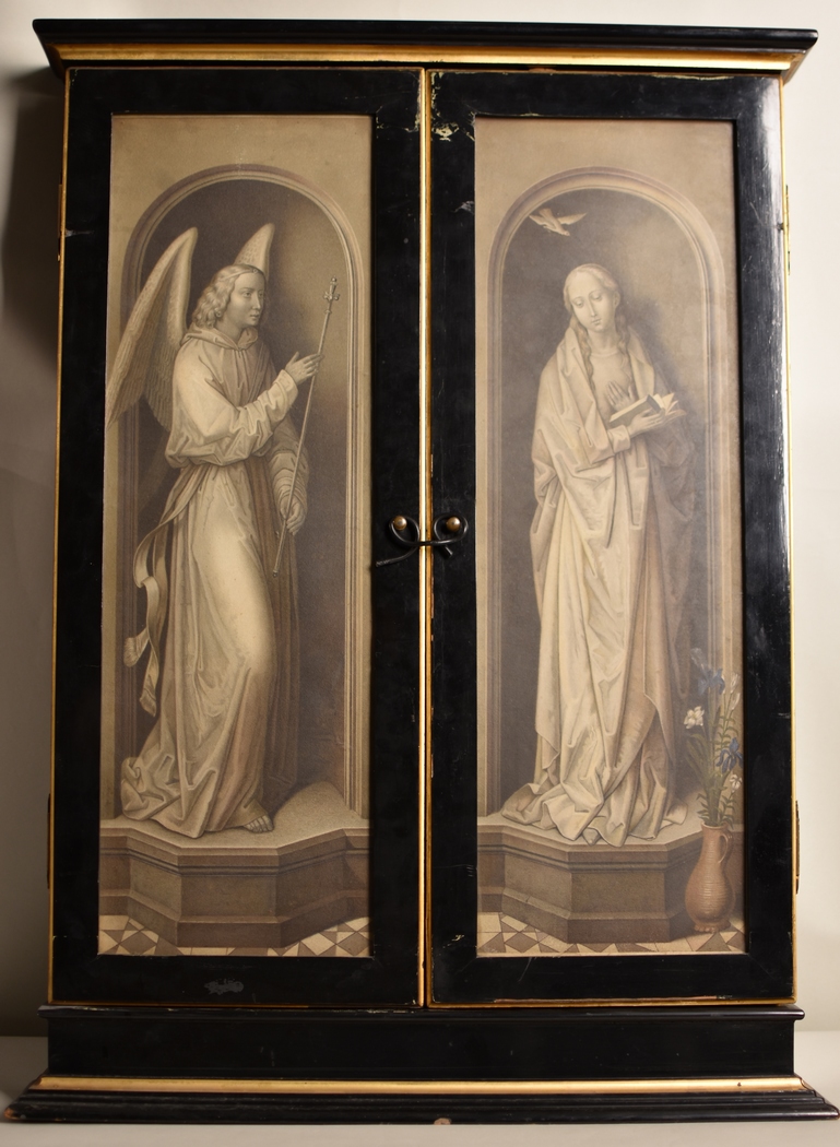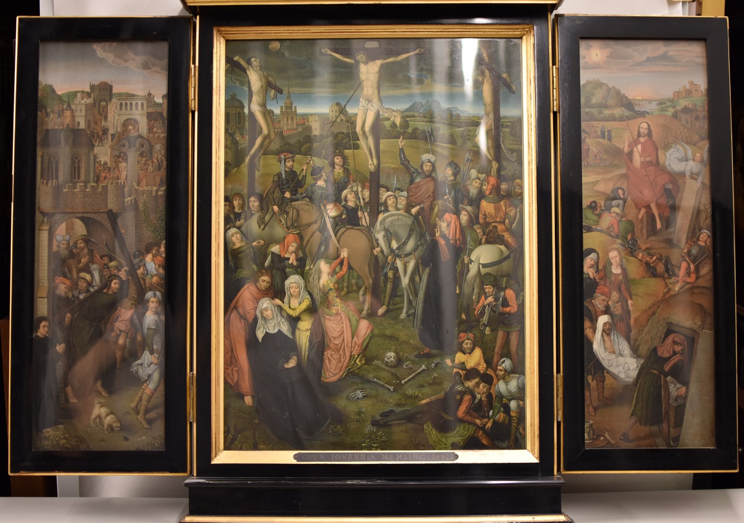 Triptiek, reproductie met vijf luiken, met kruisiging, met "opus Johannis Memling 1491"