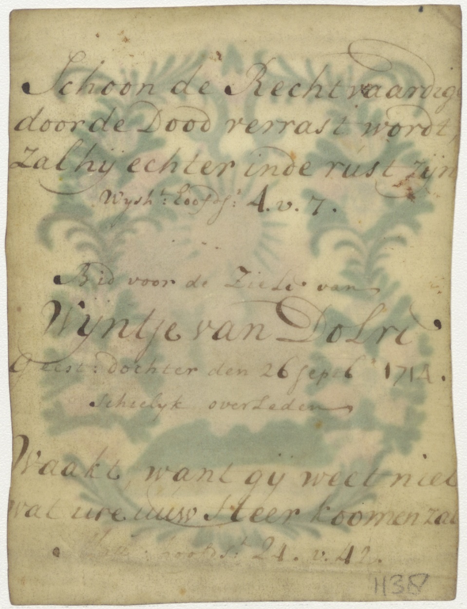 Uitgewiste heilige of Christus met bloemversiering, ingekleurd, kz. Religieus;Bid voor ziel Van Dolri;geestelijk dochter (+1714);overleden;