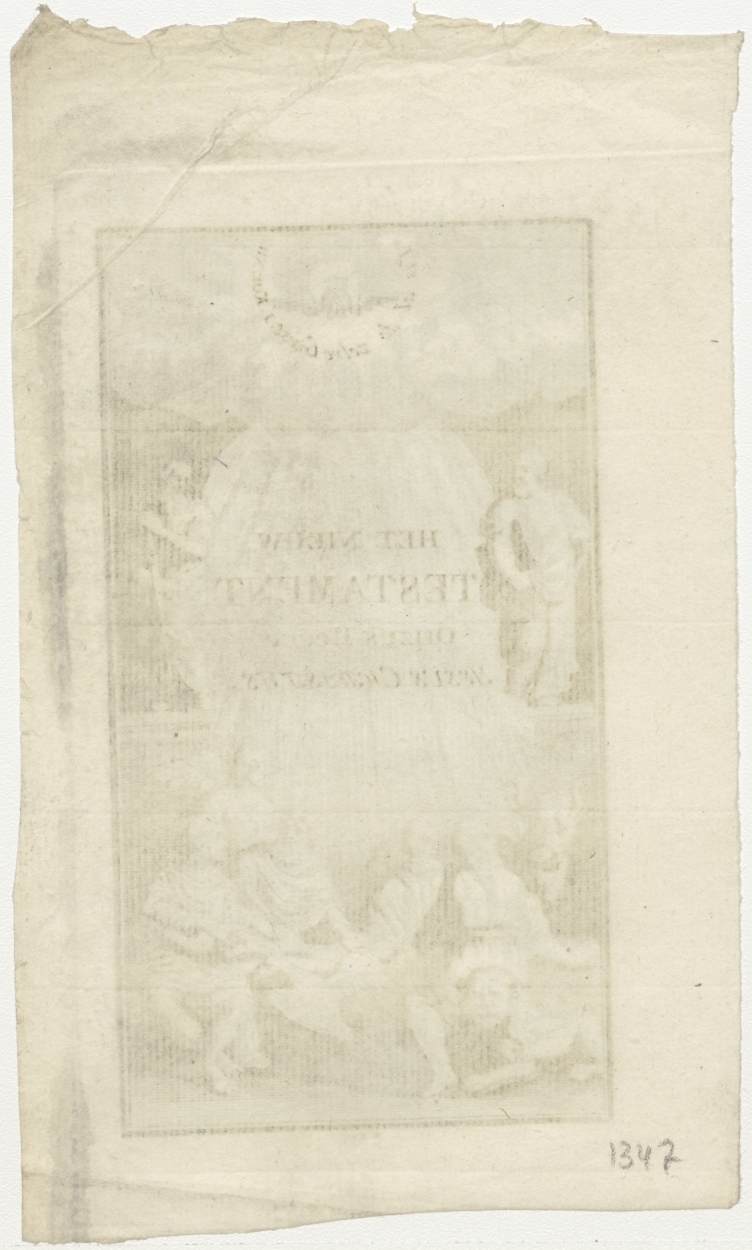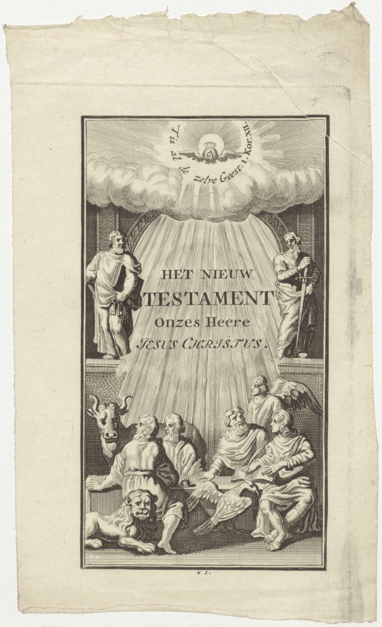Titelpagina van Het nieuw testament onzes Heere Jesus Christus, met duif en "'T is al de zelve Geest 1. Kor. XII."