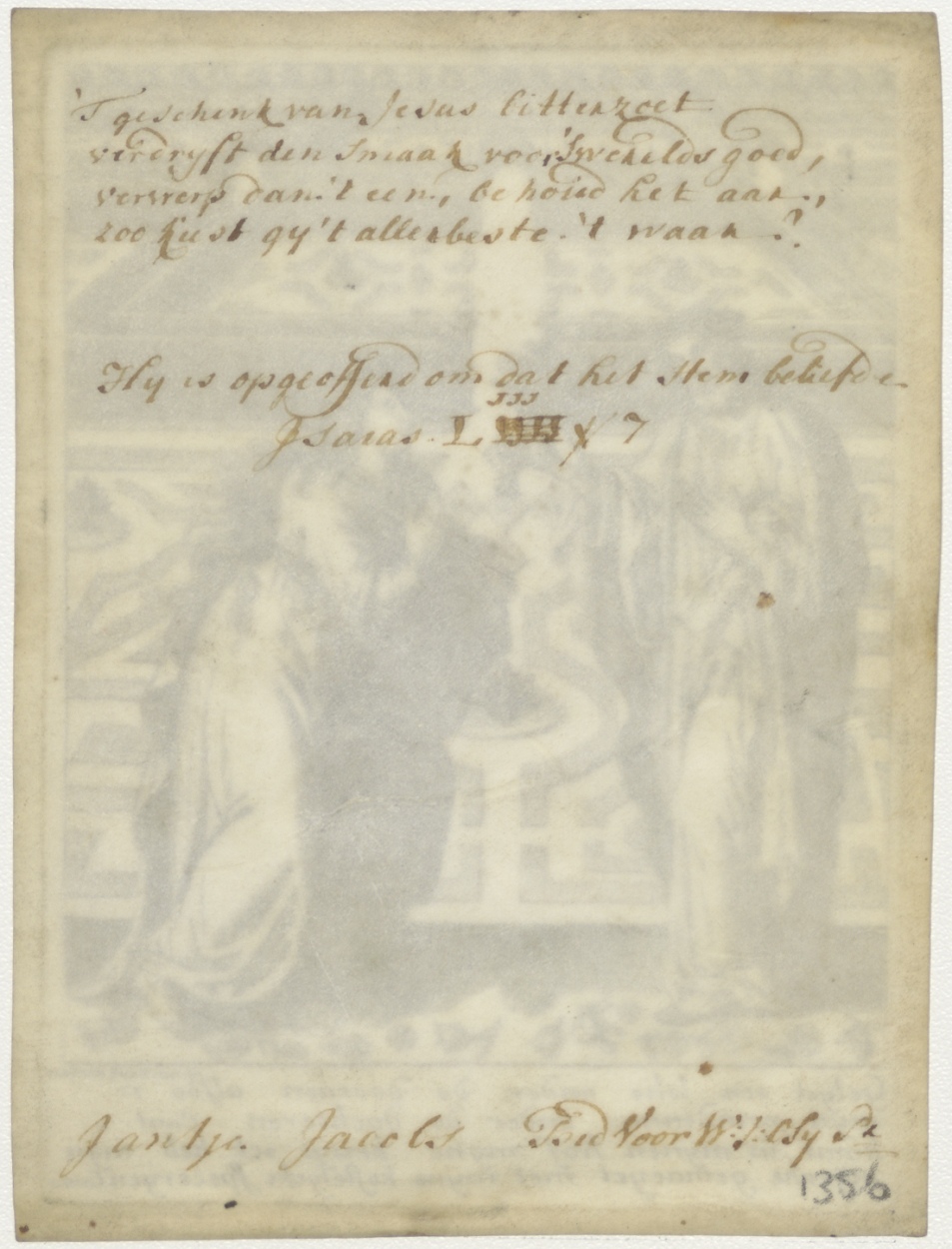 Hof met Christus en vrouw met "... Komt in mijnen hof mijne bruijt ...", kz. 't Geschenk van Jesus bitterzoet schrijft den smaak ... Jantje Jacobs bid voor W.J. Oly