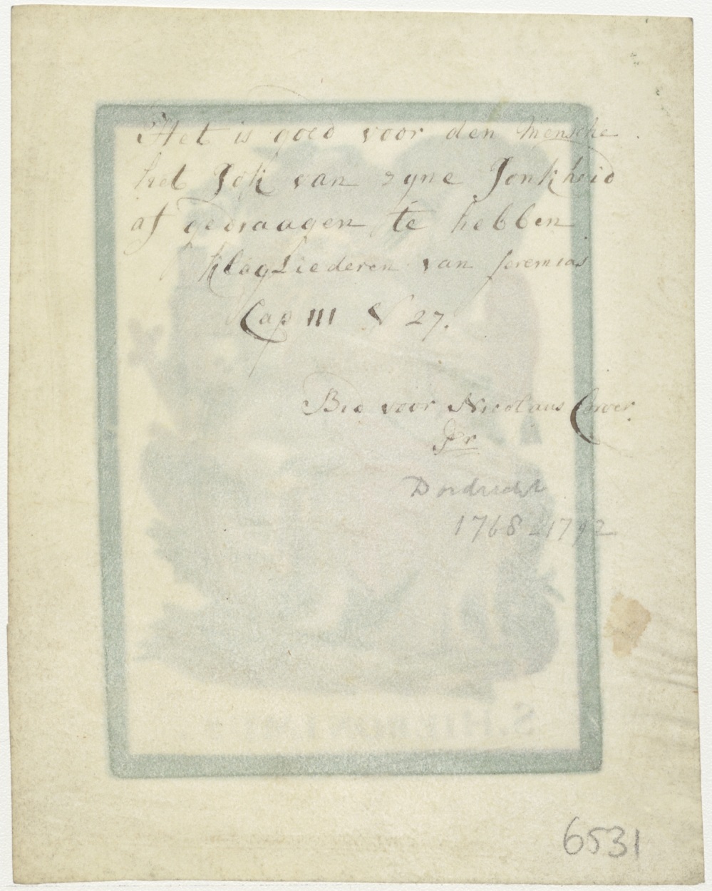 H. Hieronymus, ingekleurd, kz. Bid voor Nicolaas Corver, priester (1768-1792)