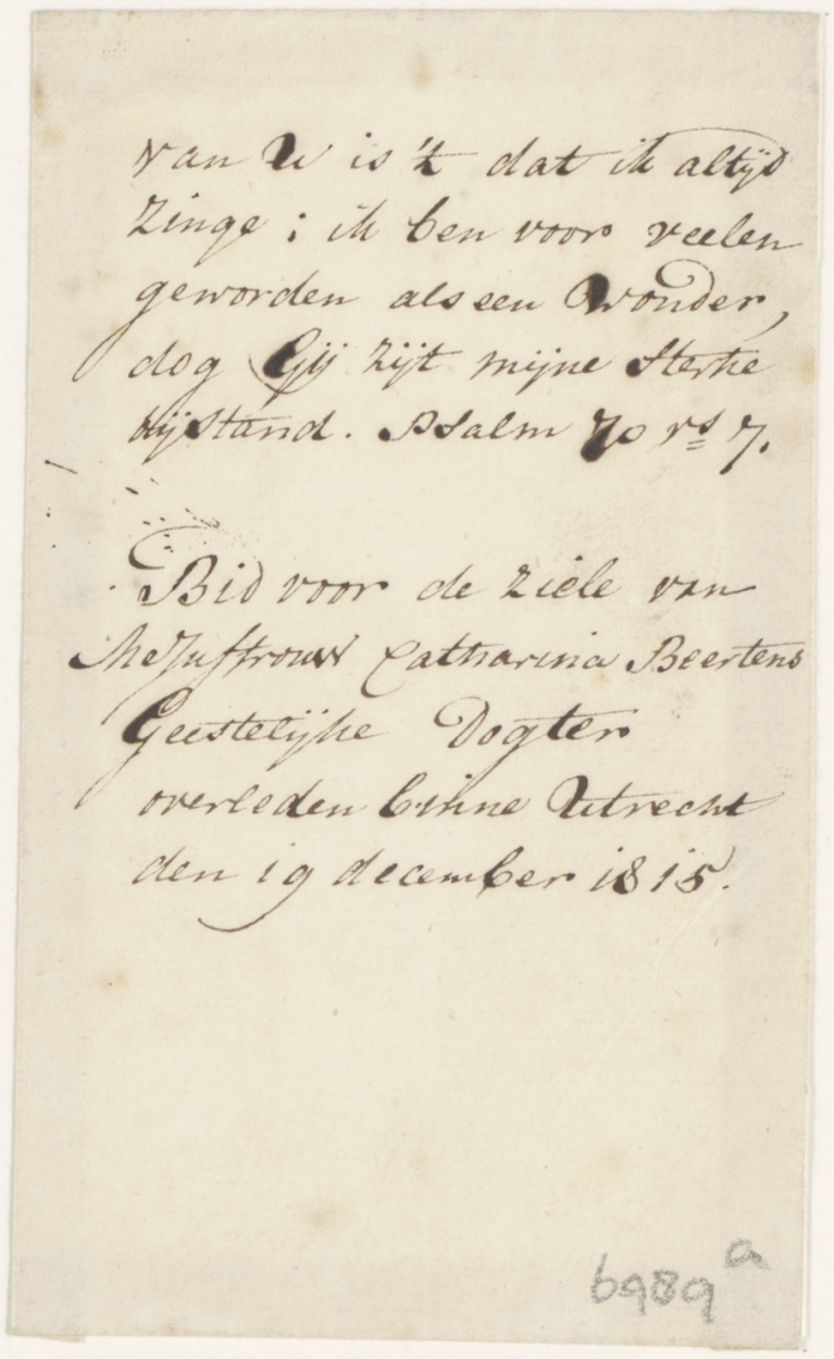 Geschreven omslagje bij nr. OKM dp6989(?), ingekleurd, kz. religieus;bid voor ziel Catharina Beertens (+1815);geestelijk dogter te Utrecht